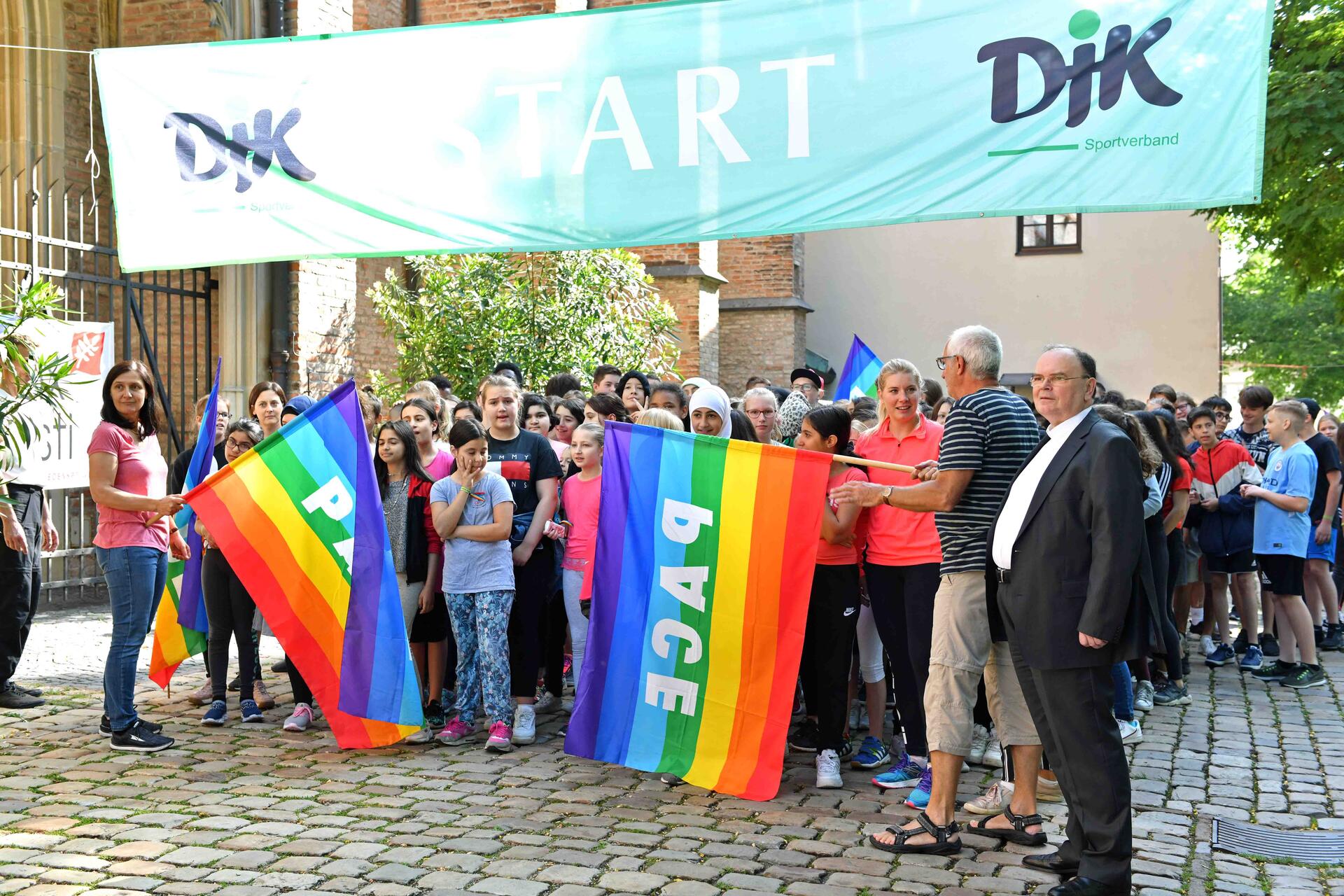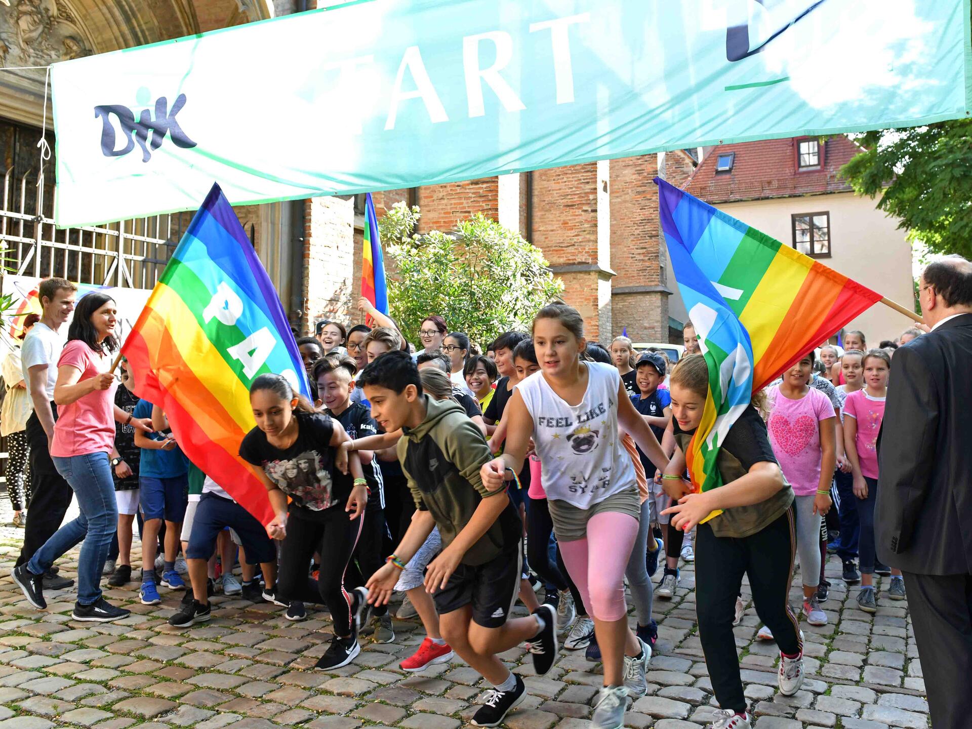 Mehr als 800 Schülerinnen und Schüler aus zehn Augsburger Schulen haben heute früh wieder für den guten Zweck ihre Laufschuhe geschnürt. Nach dem Warm-up-Programm auf dem Domplatz ertönte kurz nach 9 Uhr das Startsignal des 8. Interreligiösen Friedenslaufs. Neben den Veranstaltern von pax christi schickte auch Diözesanadministrator Prälat Dr. Bertram Meier die Läufer unter dem Motto "Dem Frieden Beine machen" auf die Strecke.