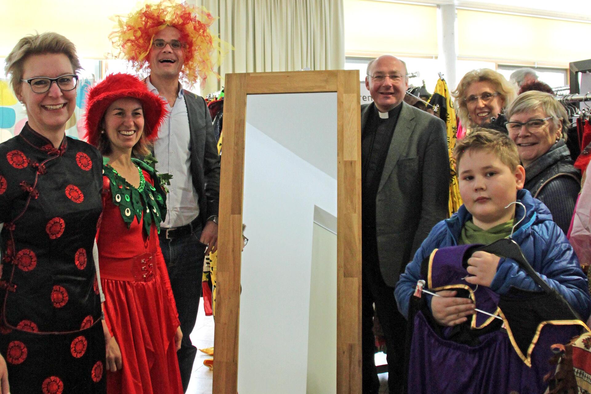 Pfarrer Dr. Ulrich Lindl (rechts neben Spiegel) und Gregor Uhl (links) eröffnen mit dem ehrenamtlichen Team aus Lauingen und Kunden die diesjährigen Secondhand-Faschingsmärkte der aktion hoffnung. (Foto: Karin Stippler / aktion hoffnung), © Karin Stippler / aktion hoffnung