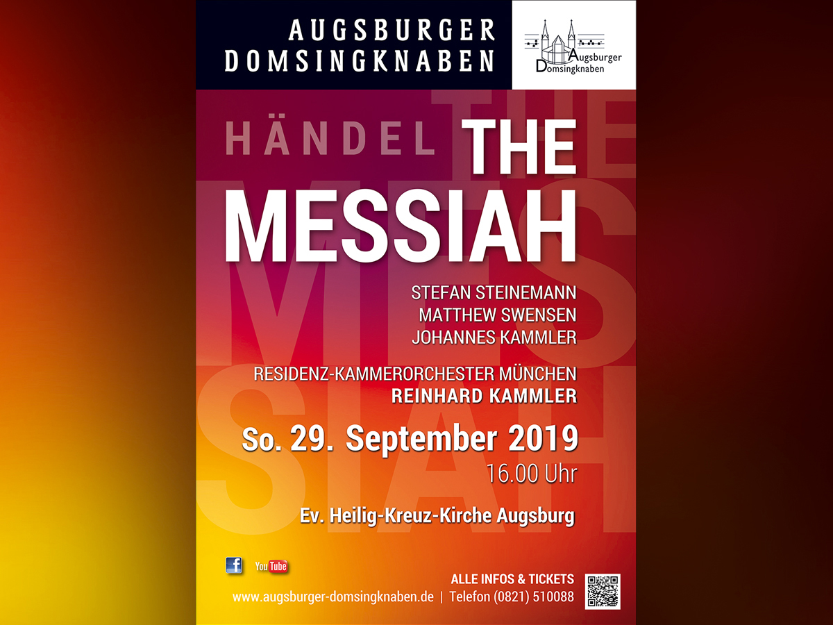 Domkapellmeister Reinhard Kammler wird am Sonntag, 29. September, 16 Uhr, in der Ev. Heilig-Kreuz-Kirche in Augsburg letztmals zusammen mit dem Residenz-Kammerorchester München und den Augsburger Domsingknaben Georg Friedrich Händels (1685-1759) großes Oratorium „Messiah“ zur Aufführung bringen. Es sind noch Restkarten erhältlich.