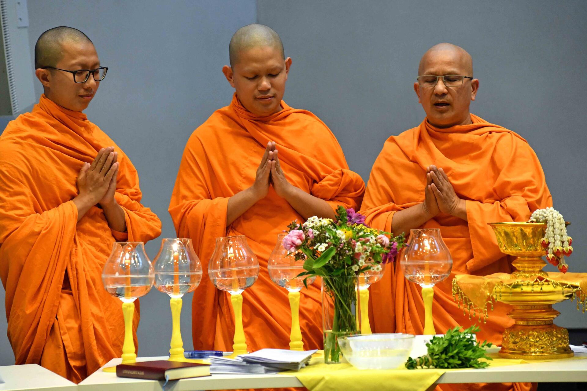 „Möge es dir an Glück, Gesundheit und Wohlstand nicht mangeln.“ Mitglieder aus zwei buddhistischen Gemeinden, die unterschiedlichen Richtungen angehören, erläuterten, dass es im Buddhismus durchaus Traditionen gibt, die eine Segenspraxis kennen: Eltern segnen ihre Kinder und die Mönche die Gläubigen. Kerze und Wasser spielen dabei eine besondere Rolle: das Leuchten der Kerze versinnbildlicht die Bitte des Gläubigen, dass sein innerer Kern immer mehr ausstrahlen möge. Und wie sich Wasser in einer Schale sammelt, so mögen sich die guten Taten in der Seele sammeln, um den Aufstieg der Seele in das Nirwana erreichen zu können.