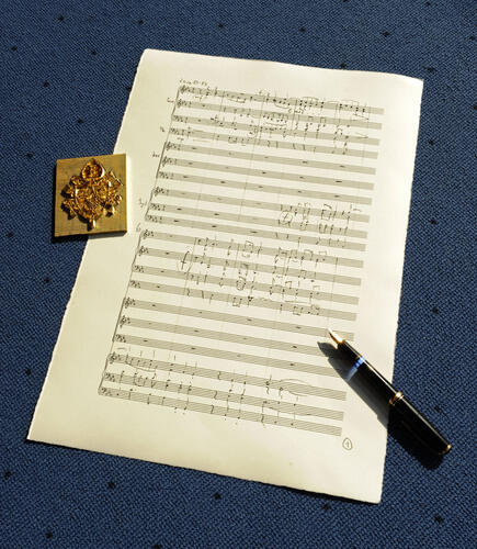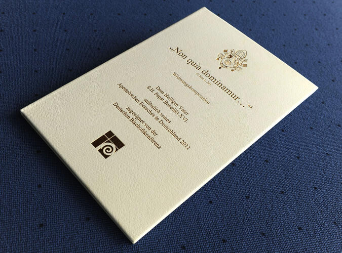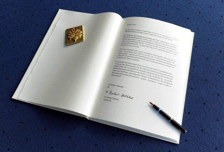 Papst Benedikt XVI. ist am Sonntagmittag mit den deutschen Bischöfen zum Essen zusammengekommen. Dabei dankte der Vorsitzende der Deutschen Bischofkonferenz, Erzbischof Dr. Robert Zollitsch, dem katholischen Kirchenoberhaupt für seinen Deutschlandbesuch und überreichte ihm als offizielles Geschenk eine eigens in Auftrag gegebene Komposition. Dabei handelt es sich um eine Vertonung des Primizspruches des jungen Joseph Ratzinger. Der Wahlspruch zu seiner Priesterweihe „Wir wollen ja nicht Herren über euren Glauben sein, sondern wir sind Helfer zu eurer Freude“ wurde von dem Eichstätter Domkapellmeister Christian Matthias Heiß komponiert.
