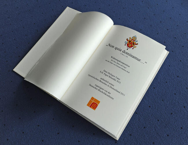 Das vierminütige Werk für Chor, Bläser, Pauken und Orgel soll laut Zollitsch bei der Herbstvollversammlung der Bischofskonferenz am 5. Oktober in Fulda uraufgeführt werden. Er gab dem Papst die Unikat-Ausgabe der Partitur, die von dem Bonner Buchbinder Werner Welter gebunden wurde. Später soll der Papst eine CD-Aufnahme von dem Werk erhalten. Nach der Uraufführung soll die Komposition vom Eichstätter Jubilate-Verlag verlegt werden. Der komplette Stimmensatz kann dann über den Musikalienhandel unter dem lateinischen Titel „Non quia dominamur“ erworben werden.