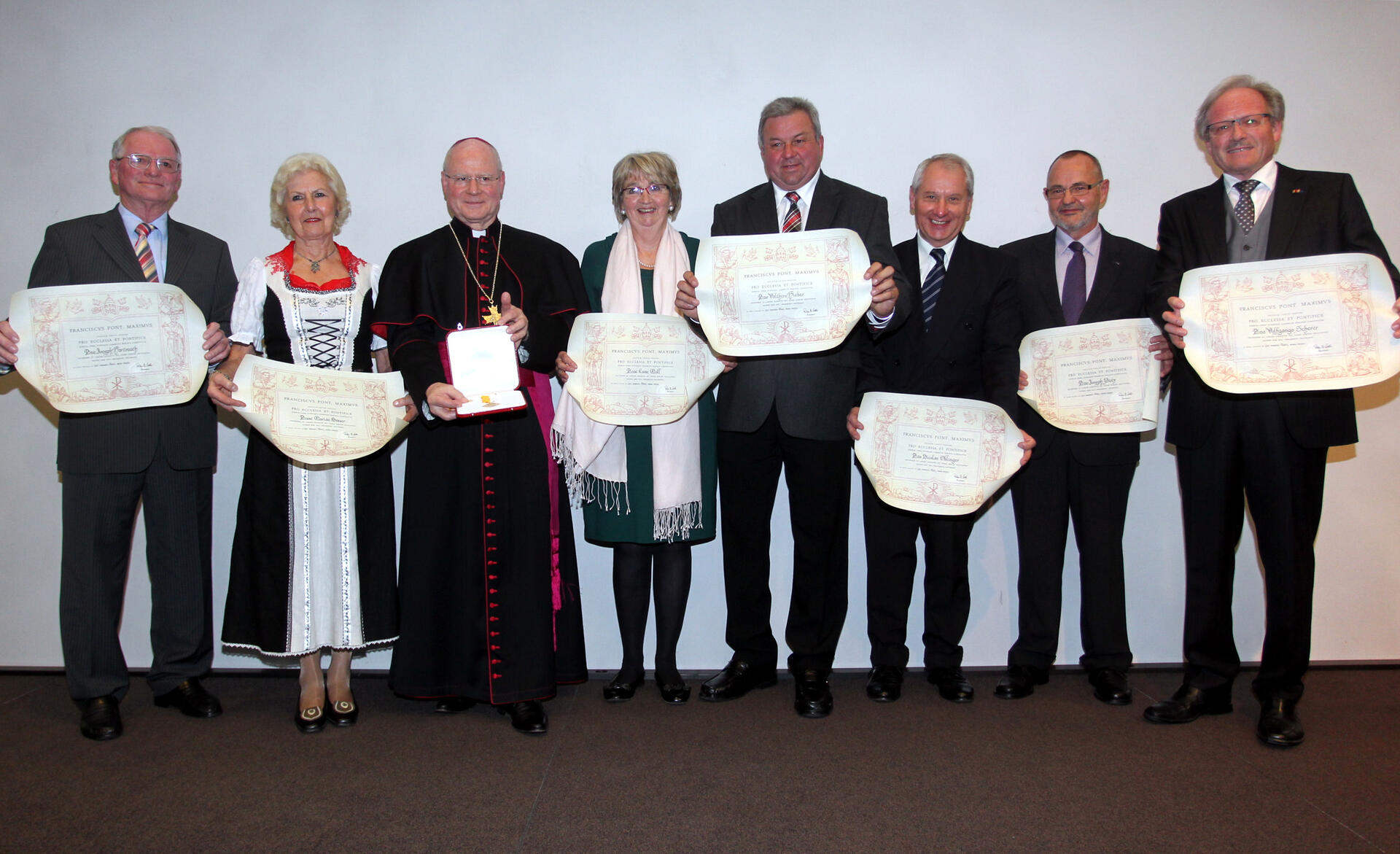 Augsburg (pba). Bischof Dr. Konrad Zdarsa hat heute während eines Festaktes im Haus Sankt Ulrich in Augsburg zahlreiche Persönlichkeiten aus dem Bistum Augsburg für ihr Engagement in Kirche und Gesellschaft ausgezeichnet. Neun Priester wurden in Anerkennung und Würdigung ihrer Dienste für die Seelsorge mit dem Titel und dem Rang eines Bischöflichen Geistlichen Rates geehrt. Für ihre hervorragenden Dienste für das Bistum Augsburg wurden zehn Laien mit der Ulrichsmedaille ausgezeichnet. Außerdem verlieh Bischof Konrad auch päpstliche Auszeichnungen. So erhielten sieben engagierte Katholiken aus dem Bistum das Ehrenkreuz „Pro Ecclesia et Pontifice“. Den päpstlichen Silvesterorden erhielten vier, den Gregoriusorden drei Persönlichkeiten.