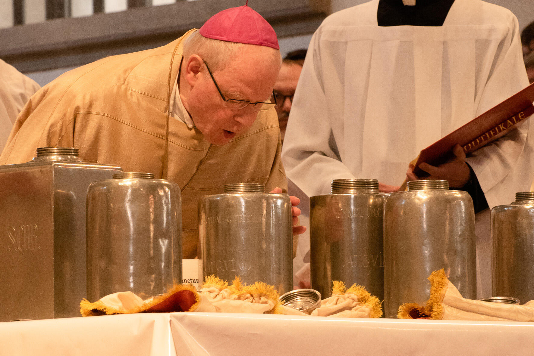 Im Anschluss weihte Bischof Konrad die heiligen Öle, die in großen Behältern zum Altar getragen wurden. Die Prozession durch das Kirchenschiff wurde von Taufbewerbern und ihren Begleitern angeführt, die das Katechumenenöl nach vorne brachten. Das Krankenöl, das für das Sakrament der Krankensalbung verwendet wird, trugen Mitarbeiter der Klinikseelsorge und der Hospizbewegung zum Altar. Jugendliche, die in diesem Jahr das Sakrament der Firmung empfangen, sowie Diakone, die heuer zu Priestern geweiht werden, brachten schließlich das Chrisamöl. Dieses wird bei Taufe, Firmung und Priesterweihe, aber auch bei Altar- und Glockenweihen verwendet. Nach der Messe wurden die heiligen Öle in kleinere Gefäße gefüllt, versiegelt und an Vertreter aus den einzelnen Dekanaten und Pfarreien überreicht.