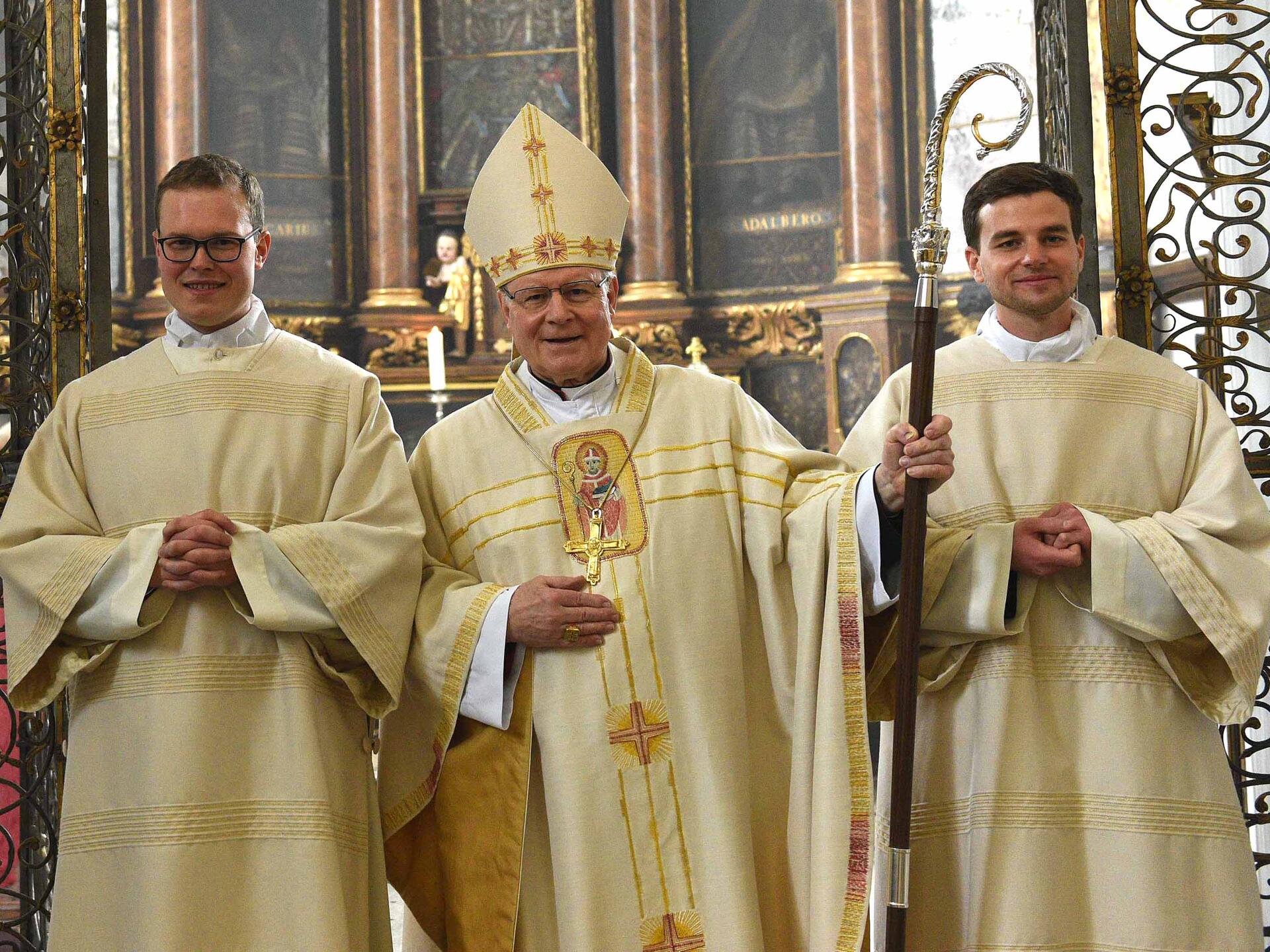 Augsburg (pba). Bischof Dr. Konrad Zdarsa hat heute in der Basilika St. Ulrich und Afra in Augsburg zwei Männer aus dem Priesterseminar St. Hieronymus durch Handauflegung und Gebet zu Diakonen geweiht: Ludwig Bolkart aus der Pfarrei Mariä Himmelfahrt in Weißenhorn und Richard Hörmann aus der Pfarrei St. Philippus und Jakobus in Bad Grönenbach. Begabt mit dem heiligen Geist und in dessen Kraft, stehe der Diakon als Helfer dem Bischof und seinem Presbyterium zur Seite: „Im Dienst des Wortes, des Altares und der Liebe ist er für alle da“, wandte sich Bischof Konrad in seiner Predigt an die Weihekandidaten.