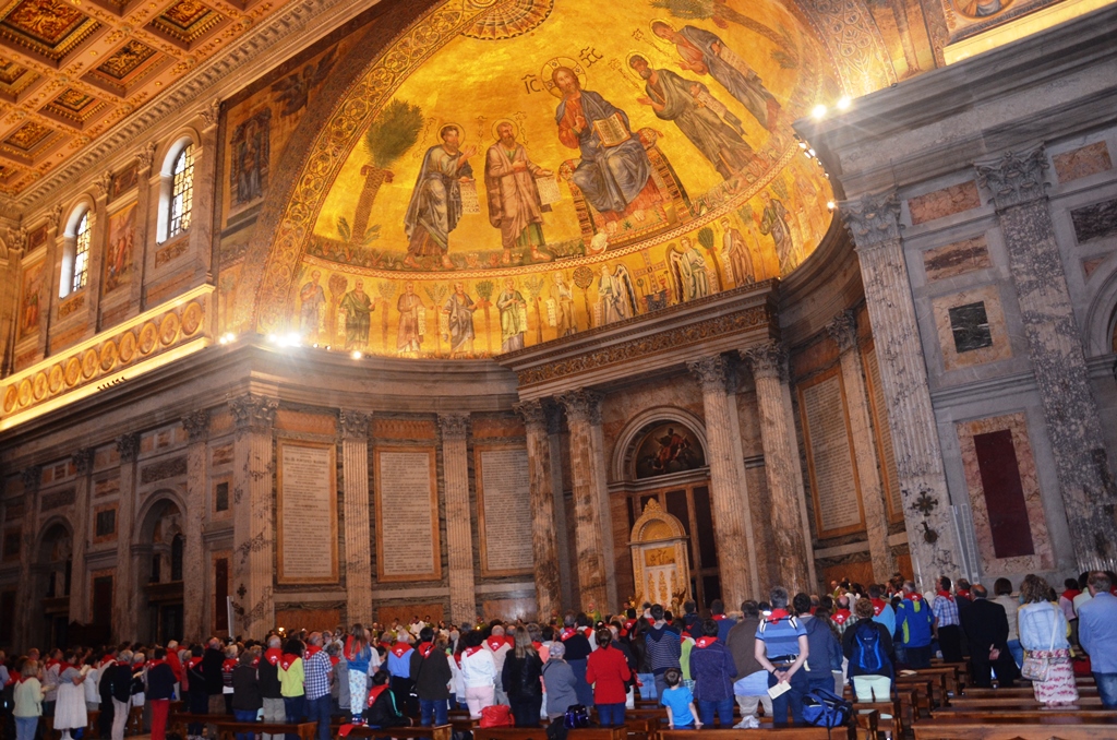 Auch der dritte Tag der Diözesanpilgerfahrt war dicht gefüllt und hielt für die Wallfahrer große geistliche Erlebnisse bereit. Am Morgen verließen alle Gruppen die Stadt auf den Spuren des Völkerapostels Paulus, der sein Leben für Christus außerhalb der Mauern als Märtyrer hingegeben hat. In der Basilika Sankt Paul vor den Mauern zog die gesamte Gruppe mit Bischof Konrad durch die Heilige Pforte ein und feierte einen Gottesdienst unter dem beeindruckenden Christusmosaik. Im Blick auf das Tagesevangelium forderte der Bischof dazu auf, die Schöpfung bereits da zu bewahren, wo Gott den Menschen als Mann und Frau geschaffen habe. Familien fürsorglich zur Seite zu stehen, sie zu ermutigen und zu unterstützen sei Aufgabe jeder Pfarrgemeinde, ja jedes Christen, so Bischof Konrad. Dies sei besonders dort bedeutsam, wo das Jawort der Treue zueinander schwierig werde.