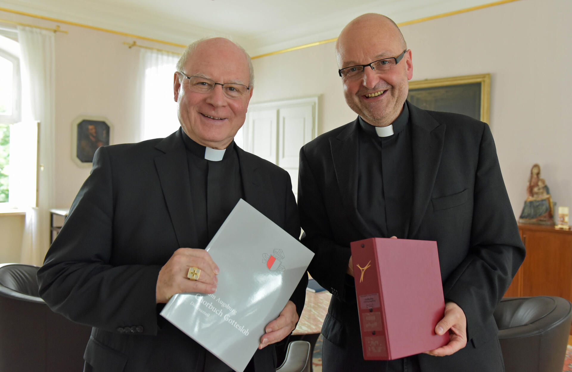 Augsburg (pba). Das Amt für Kirchenmusik hat ein Chorbuch sowie eine Ausgabe für Sehbehinderte zum diözesanen Eigenteil des neuen Gotteslobes herausgegeben. Heute hat Pater Stefan Kling, Leiter des Amtes für Kirchenmusik, die beiden Neuerscheinungen an Bischof Dr. Konrad Zdarsa überreicht. „Das neue Gotteslob ist der Träger der frohen Botschaft Jesu“, erklärte Pater Stefan. Die Lieder und Gesänge seien Wesenselement der Liturgie und trügen unverzichtbar zum Lobpreis Gottes bei, so der Leiter des Amtes für Kirchenmusik.