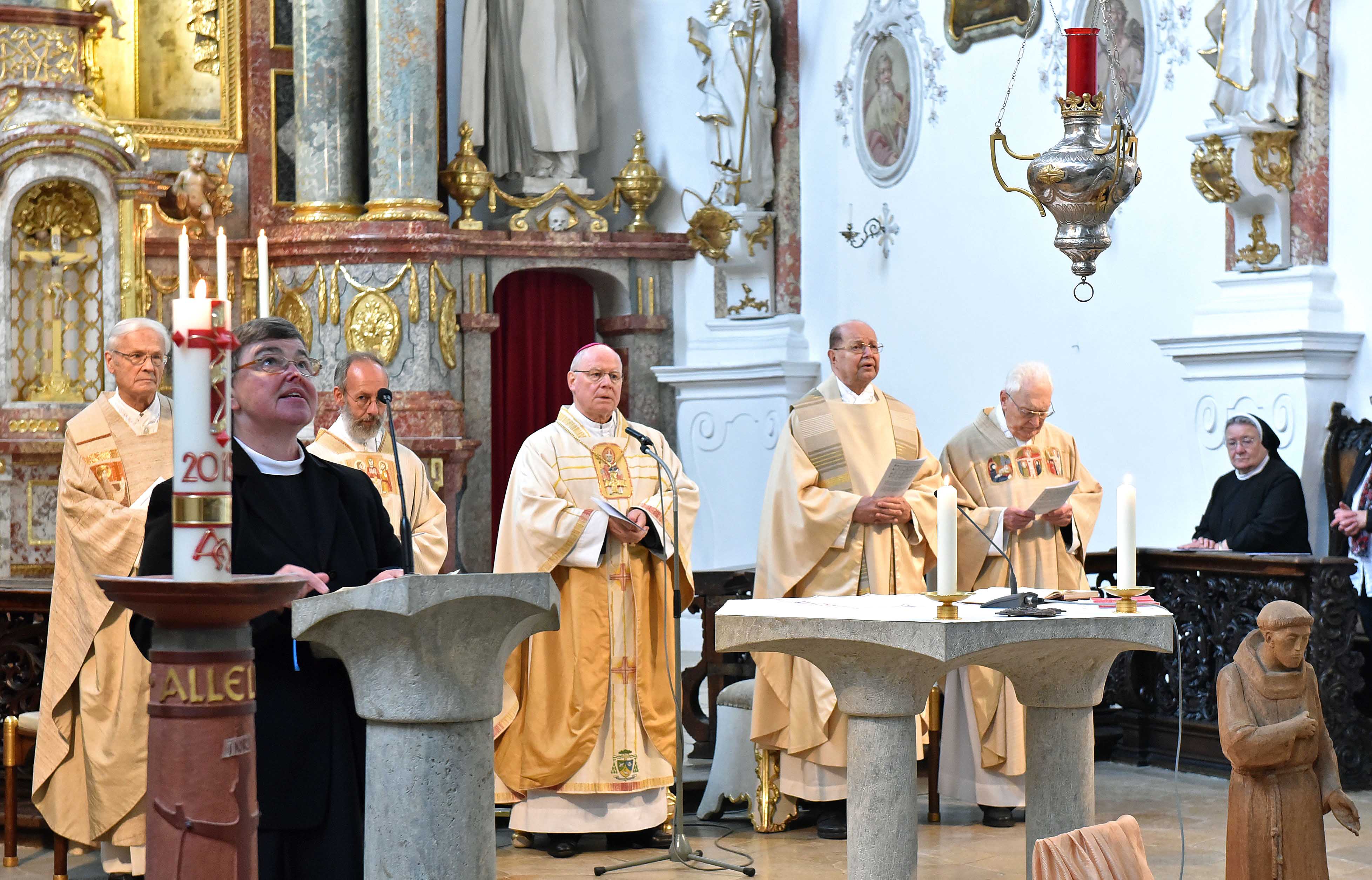 Im Namen aller anwesenden Franziskanerinnen begrüßte Provinzoberin Schwester Elke Prochus den Bischof: „Wir freuen uns, dass Sie sich Zeit nehmen, hier mit uns den ersten Gottesdienst in der von allen Spuren des Brandes gesäuberten Kirche zu feiern.“ Nach Bekanntwerden des Brandes sei Bischof Konrad der Erste von außerhalb gewesen, der seine Anteilnahme ausgesprochen habe. „Ihre brüderliche spontane Solidarität und Ihre Gebetsunterstützung haben uns gestärkt und wohlgetan. Wir werden das nie vergessen“, so Schwester Elke an den Bischof gerichtet. Große Unterstützung habe es seit dem Brand auch von den Gläubigen der Umgebung gegeben. Zum Dank wollen die Franziskanerinnen daher mit der ganzen Bevölkerung und all jenen, die sie unterstützt und begleitet haben, am Samstag, 15. Oktober, in der Klosterkirche einen Gottesdienst feiern.