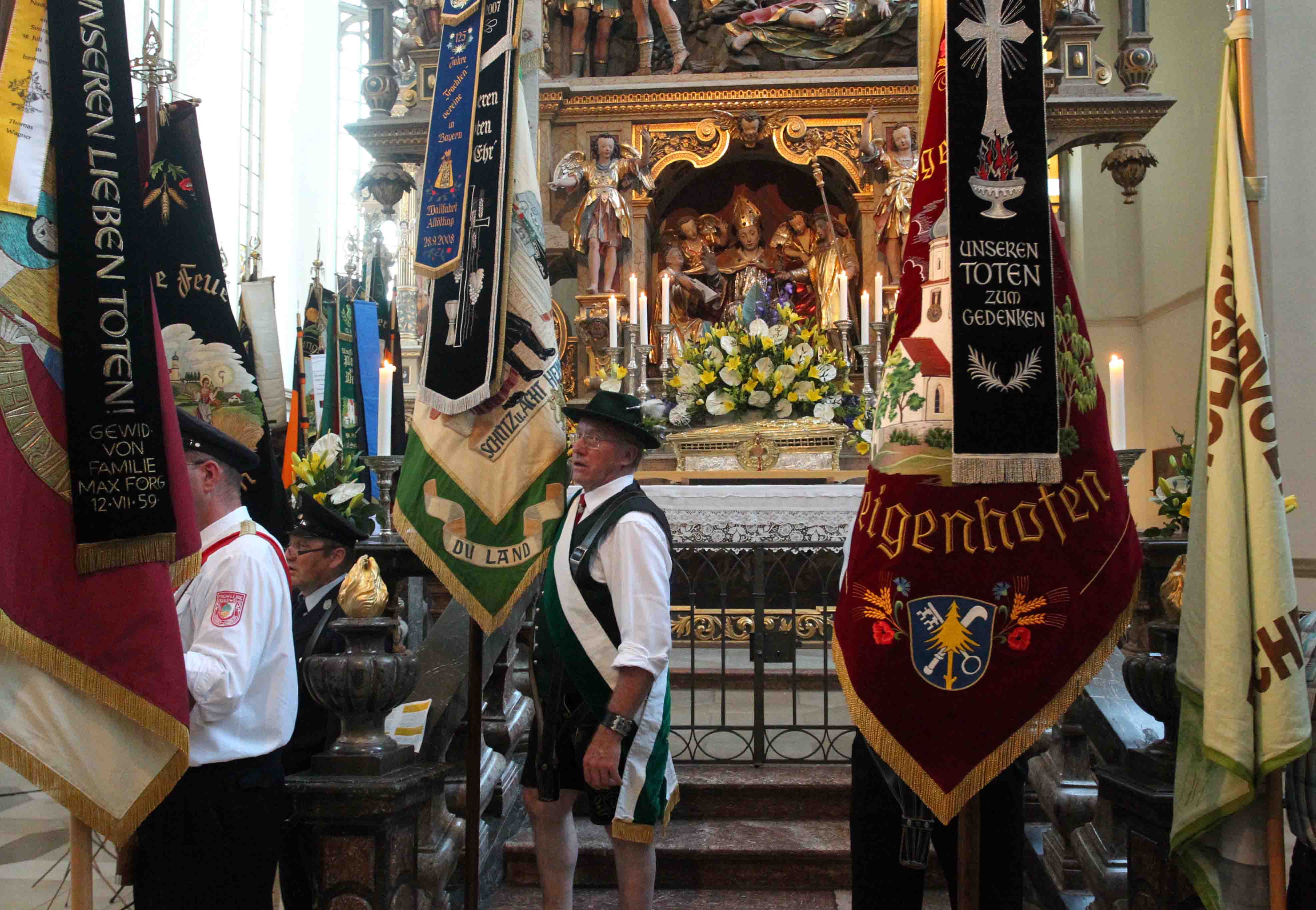 Augsburg (pba). Einfach nur Männer: Junge und Alte, Väter mit ihren Söhnen, Feuerwehrleute in Uniformen, Dutzende Banner- und Fahnenträger aus dem ganzen Bistum und vorneweg drei Polizeimotorräder mit Blaulicht: Gestern Abend sind sie wie immer während der Ulrichswoche vom Augsburger Dom vorbei am Rathaus und über die Maximilianstraße in einer nicht enden wollenden Prozession zur Ulrichsbasilika gezogen. Darunter auch zwei Dutzend Männer, die von Türkheim aus 24 Stunden lang zum Grab des heiligen Ulrich gepilgert waren.