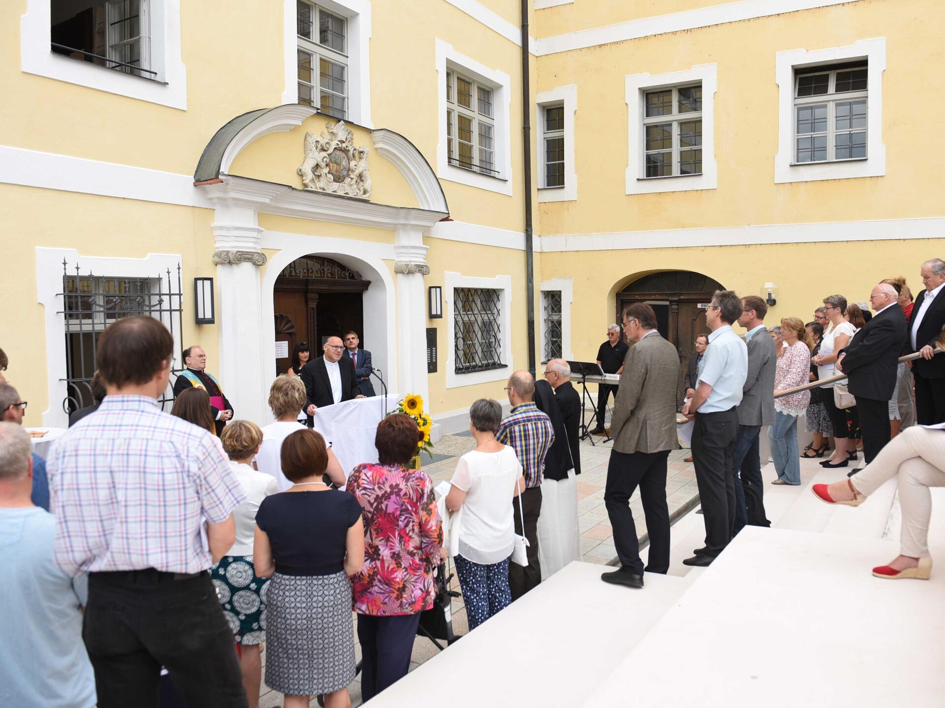 Augsburg / Donauwörth (pba). Diözesanadministrator Prälat Dr. Bertram Meier, Leiter des Bischöflichen Seelsorgeamts, hat heute Vormittag die neuen Räume der Außenstelle Donauwörth gesegnet. „Ich freue mich sehr, dass es zu diesem gemeinsamen Projekt gekommen ist.“ Diese konzentrierte Aktion sei Zeichen dafür, „dass Sie vom Nebeneinander wegkommen und das Miteinander stärken möchten“, wandte sich der Diözesanadministrator an die rund 100 Festgäste, die zur Segensfeier am Vorplatz des Prälatentrakts des Klosters Heilig-Kreuz gekommen waren.