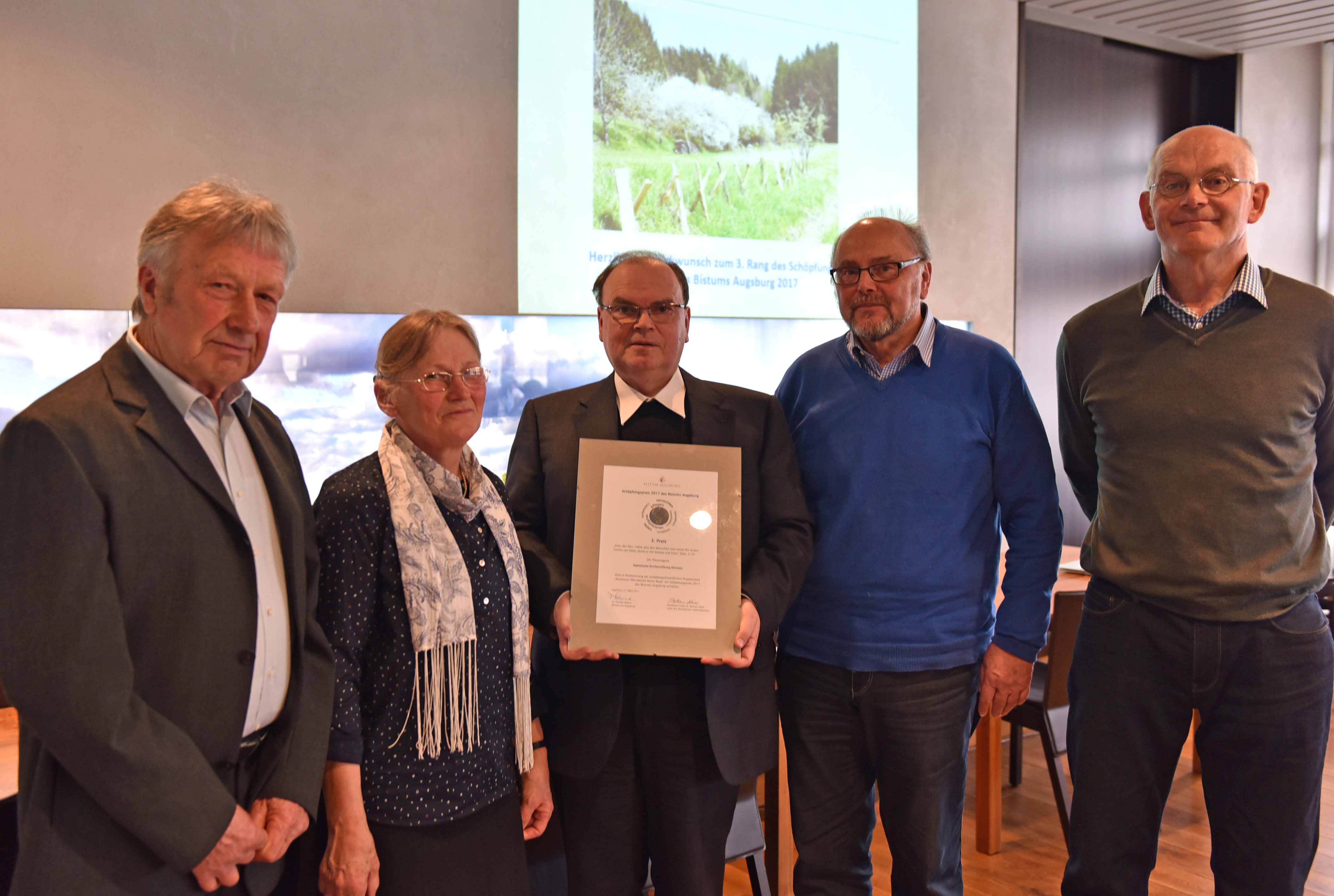 Prämiert wurde ein Renaturierungsprojekt einer bisher landwirtschaftlich genutzten Pfarrpfründe-Fläche von 1,7 Hektar. Sie wurde umgewandelt in eine Wiesenlandschaft mit Sträuchern und Bäumen. Die Gestaltungs- und Pflegemaßnahmen der Mitglieder der Pfarrei St. Johann Baptist in Alsmoos haben dazu geführt, dass das Artenspektrum deutlich erhöht wurde. 48 Pflanzenarten konnten bestimmt werden. Dadurch wurden auch seltene Insekten wie der Schwalbenschwanzschmetterling angezogen. Bei der gesamten Pflege wird auf den Einsatz von Düngern und Chemikalien verzichtet. Mittlerweile zählt die Wiese als Ausgleichsfläche für andere Bau- und Bewirtschaftungsmaßnahmen im Sinne eines Ökokontos. Dieses Projekt zeigt, dass Flora und Fauna in ihrer Vielfalt zurückkommen können. Es kommt darauf an, ihnen ihren Lebensraum zurückzugeben. Durch die Lage und Bewirtschaftung dieser kirchlichen Fläche wird in hohem Maße die Artenvielfalt, Biodiversität und das Bewusstsein für die Bewahrung der Schöpfung innerhalb der Pfarrei gefördert.