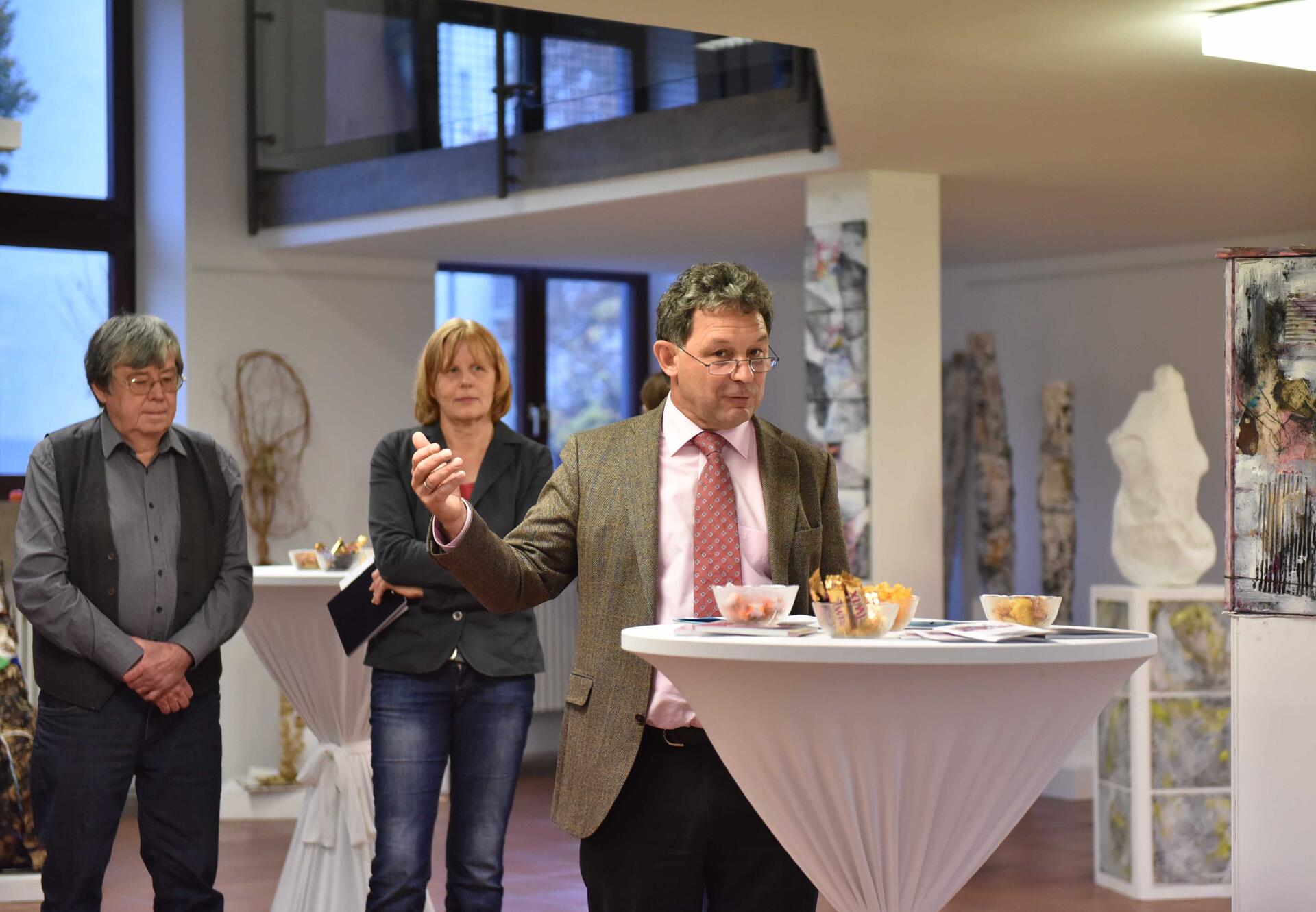 In ausführlichen Dankesworten stellte Dr. Anton Schuster, Leiter der Abteilung Fortbildung, die Werke der beiden Künstler näher vor. Allesamt kreisen sie um das Grundmotiv des „Turmes“ und des „Turmbaus“. Mit biblischen Bezügen erinnerte Dr. Schuster an die Schönheit, Faszination und Anmut, die Türmen stets inne wohne, stellte jedoch gleichzeitig deren Bedeutung von Hybris, Erhabenheit und Macht als Parallele in den Raum. „Diese Ausstellung regt ohne Zweifel zum Nachdenken an“, lobte Schuster das künstlerische Niveau der Ausstellungsstücke.
