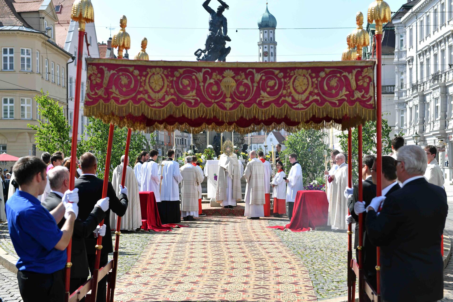 Die Gläubigen der Stadtpfarreien werden zuvor ebenfalls um 8 Uhr in ihren Kirchen die Eucharistie feiern. Anschließend treffen sie sich vor dem Hohen Dom zur gemeinsamen Prozession, die vom Hohen Weg über die Karolinen- und die Maximilianstraße zum Herkulesbrunnen und wieder zurück zum Dom führen wird. Die vier Fronleichnamsaltäre werden von den Stadtpfarreien St. Georg (Portal des Augsburger Rathauses), St. Ulrich und Afra (Herkulesbrunnen), St. Moritz (Merkurbrunnen) sowie von der Dompfarrei (Römermauer vor dem Dom) gestaltet. Die Anwohner des Prozessionsweges und die Geschäftsinhaber werden herzlich darum gebeten, ihre Häuser festlich zu schmücken.