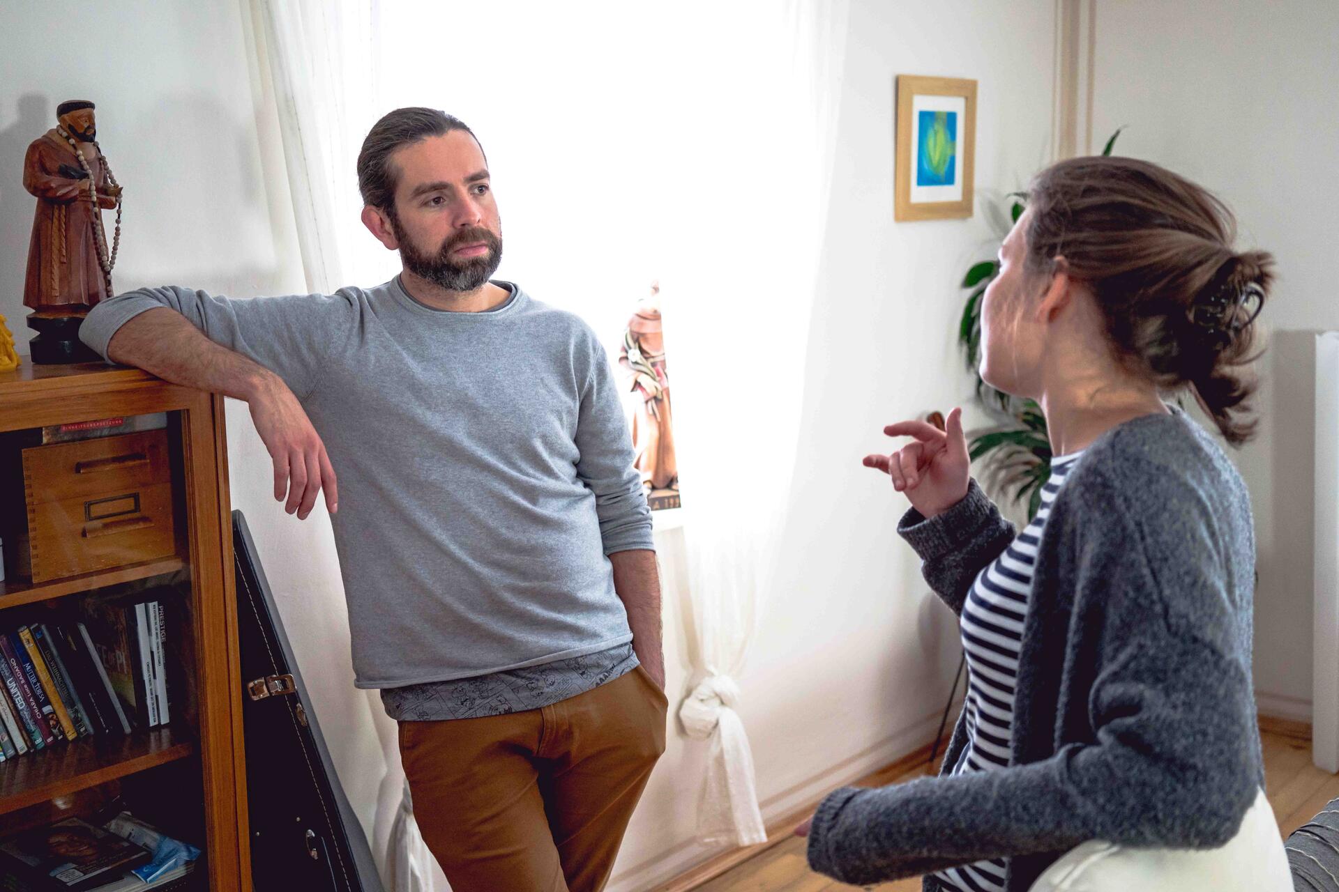 Projekt Gott im Abseits: die Journalistin Christina Hertel berichtet über ihre Erfahrungen auf der Fazenda da Esperança in Bickenried. Hier ist sie im Gespräch mit Luiz Fernando Braz, der sich der Arbeit mit ehemals Drogenabhängigen verschrieben hat. (Foto: Zentrum für Berufungspastoral / Can Erdal), © Zentrum für Berufungspastoral / Can Erdal