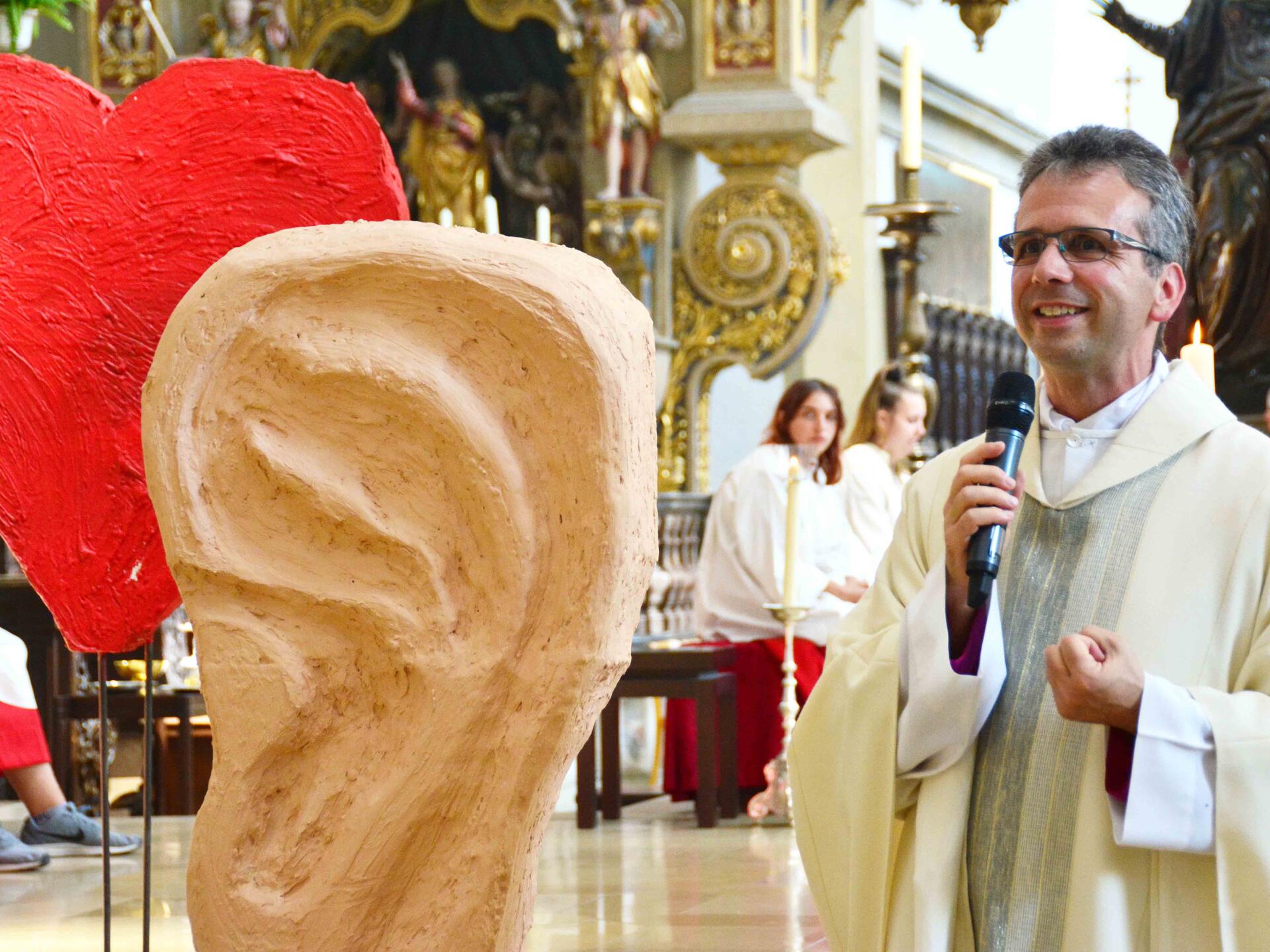 Veranschaulicht wurde das mit einem großen Ohr und einem großes Herzen aus Pappmaché, gefertigt von Nortrud Bräuer aus dem KJF Berufsbildungs- und Jugendhilfezentrum Sankt Nikolaus in Dürrlauingen im Landkreis Günzburg. Passend und mit Schwung gestaltete der Chor der Nikolaus-von-Myra-Schule in Dürrlauingen unter der Leitung von Elfriede Weigelt den musikalischen Part der Heiligen Messe. Ergänzt dazu hatte Winfried Vitzthum aus dem Frère-Roger-Kinderzentrum ein Lied geschrieben: „Sprich du zu mir“, eigens komponiert zur diesjährigen Ulrichswoche und gesungen von der 16-jährigen Caro Kuhn.