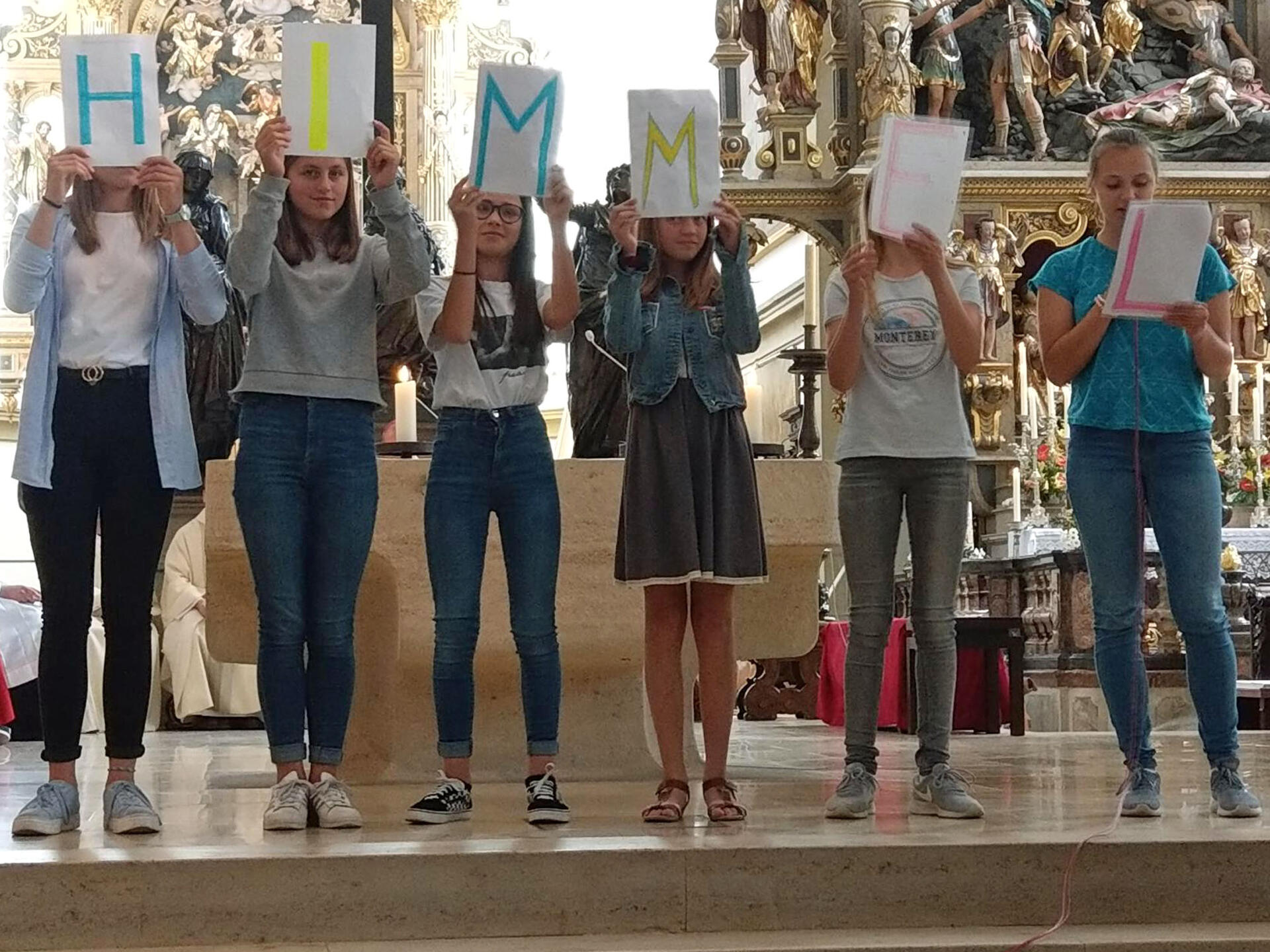 Was dies im Schulleben heißen kann, führten Schülerinnen des Marien-Gymnasiums unter der Leitung von Stefanie Thomamüller vor, indem sie als Fernsehbeitrag verpackt die vielen sozialen Projekte ihrer Schule vorstellten. Auch musikalisch hat die Schule einiges zu bieten, wie die sunshine-Band unter der Leitung von Michael Bauer bewies, die mit viel Können die Lieder des Gottesdiensts beschwingt anstimmte. Mit dem Text eines dieser Lieder und gestärkt von dieser gemeinsamen Feier brachen die Schulwerksschulen in die letzten Wochen des Schuljahres auf: „Unterwegs in eine neue Welt, in der ein Glaube uns zusammenhält.“