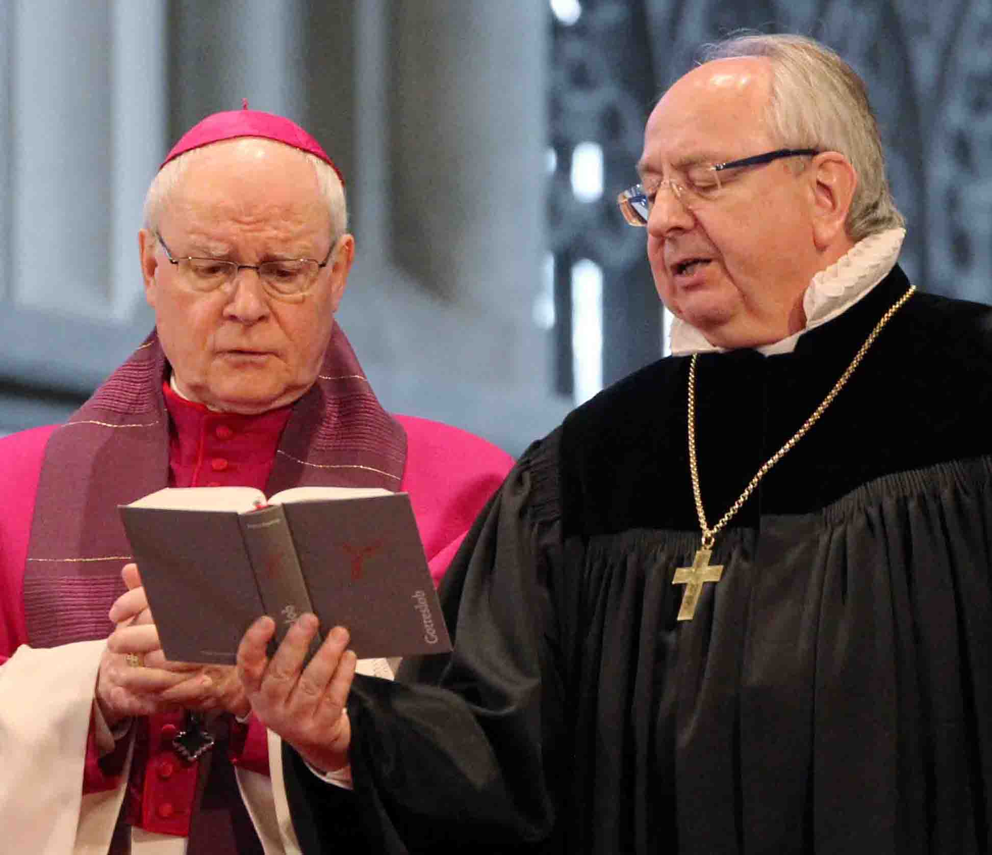 Dieser Gottesdienst solle nicht folgenlos bleiben, unterstrich Bischof Konrad am Ende der etwas länger als eine Stunde dauernden Liturgie. Beide Bischöfe trugen deshalb abwechselnd verschiedene Selbstverpflichtungen vor: Etwa die grundlegenden Gemeinsamkeiten im Glauben in allen Formen der Verkündigung hervorzuheben und gemeinsam in dieser Welt Zeugnis von Gott abzulegen; die ökumenische Kultur des Dialogs und der Zusammenarbeit auf allen Eben kirchlichen Lebens zur fördern und im Vertrauen auf die Kraft des Heiligen Geistes alles zu unterlassen, was Anlass zu neuen Zerwürfnissen zwischen den Kirchen gibt; sowie den konfessionsverschiedenen Ehen alle Hilfestellungen zu leisten, die ihren gemeinsamen Glauben stärken und die religiöse Erziehung ihrer Kinder fördern. Diese Selbstverpflichtungen und der Segen durch die beiden Bischöfe setzten den Schlussakzent des Gottesdienstes – bevor die Gemeinde „Nun danket alle Gott“ sang und die Zelebranten mit Applaus verabschiedete.