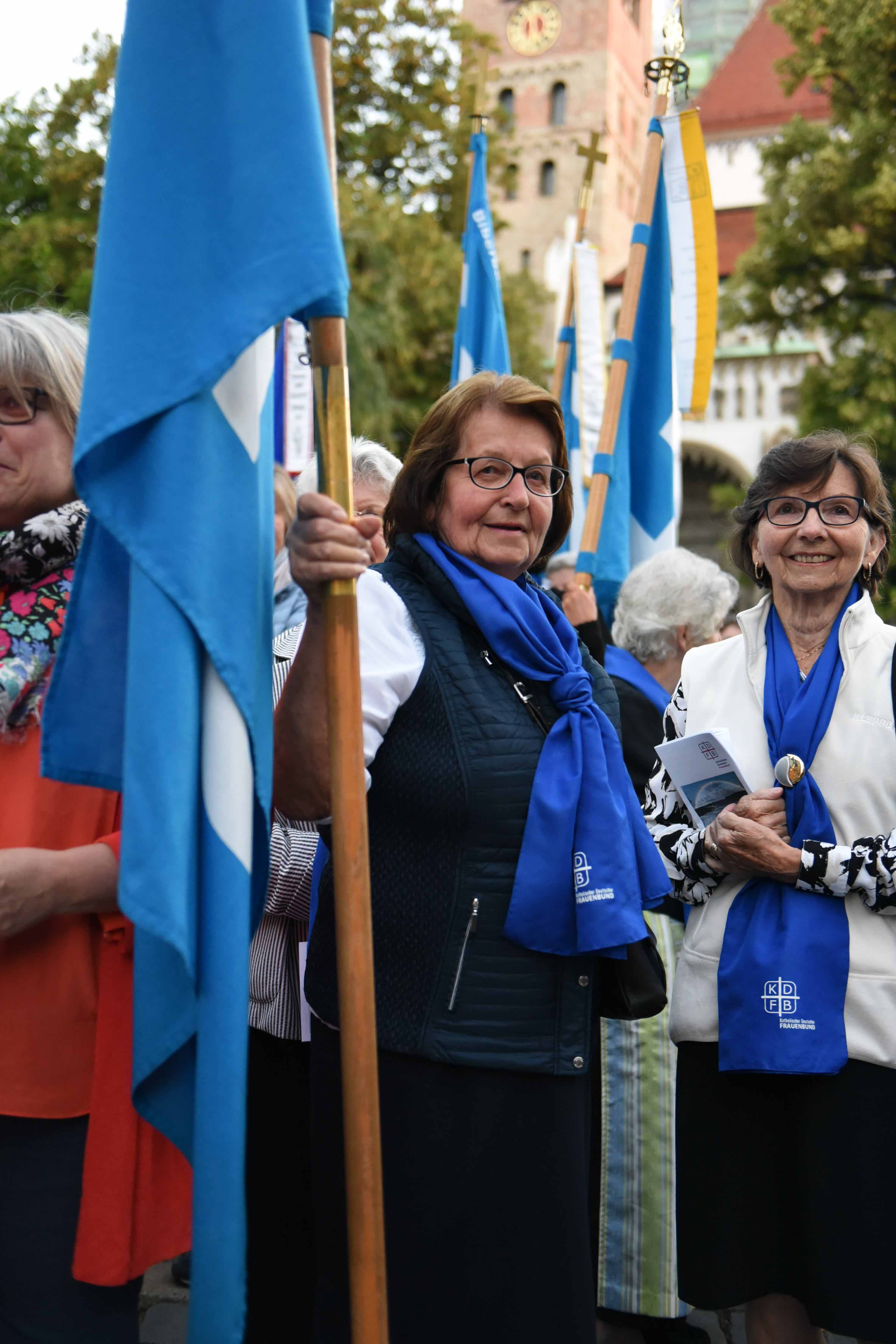 Augsburg (pba). Traditionell am Mittwoch in der Ulrichswoche pilgern die Frauen in den frühen Morgenstunden zum Grab des Bistumspatrons. So auch heute: Begleitet von Weihbischof Florian setzte sich der Pilgerzug mit rund vierhundert Frauen ausgehend vom Dom über die Maxstraße bis hin zur Basilika St. Ulrich und Afra in Bewegung. Neben dem Wegkreuz, das den Wallfahrerinnen vorausging, umsäumten auch zahlreiche blaue und weiße Fahnen den Pilgerzug. Sie wurden von den Frauen aus den teilnehmenden Zweigvereinen des Katholischen Deutschen Frauenbunds im Bistum Augsburg (KDFB) getragen.