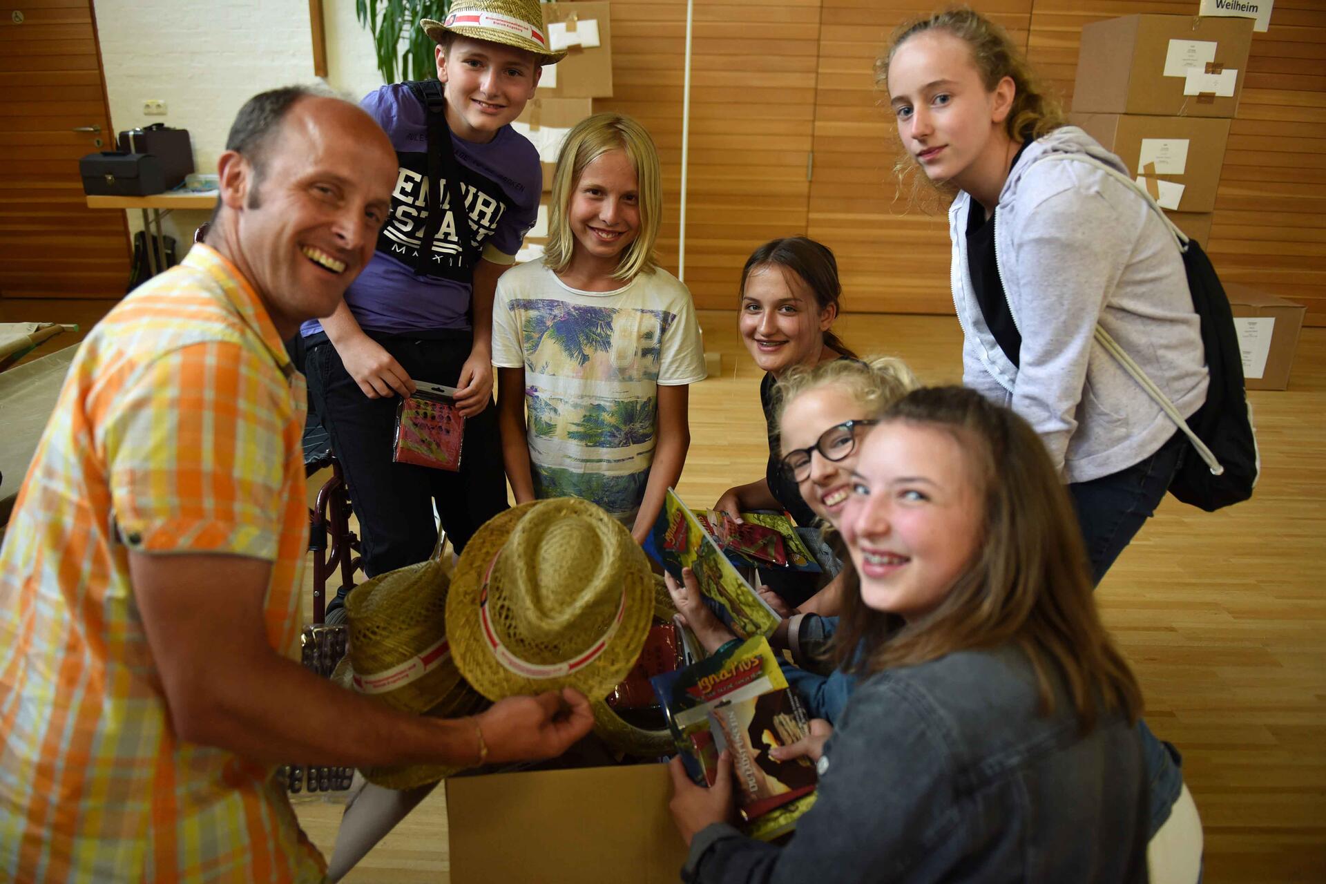 Im Anschluss an den Gottesdienst wurden die Gruppen mit den notwendigen Pilgerpaketen versorgt: Neben einer CD mit den Liedern der Messe „Du lädst uns ein!“ finden sich darin auch ein Liederheft und Schal, ein Armband und ein Hut.