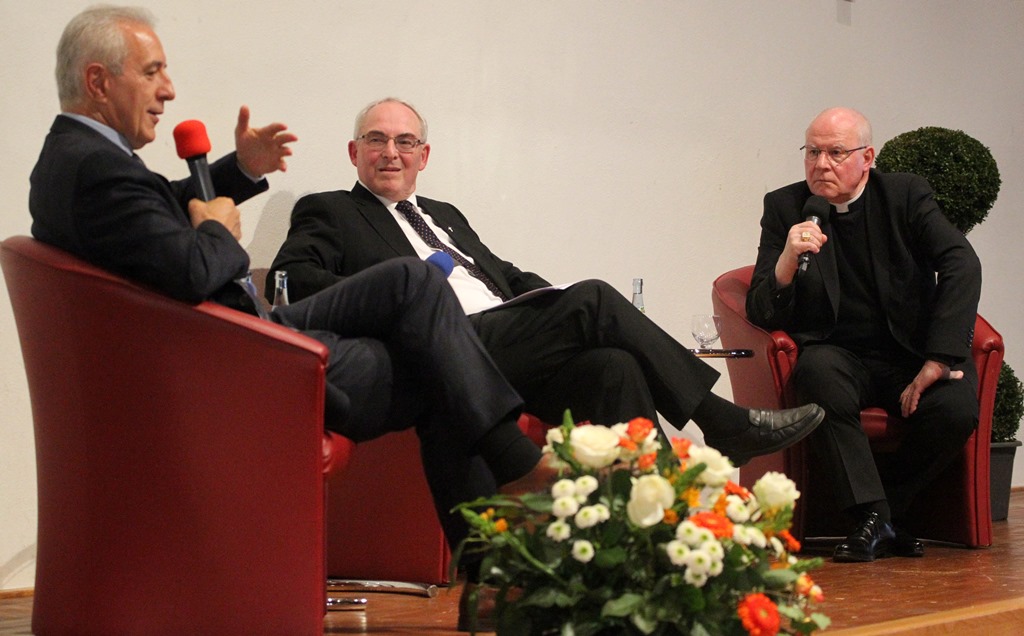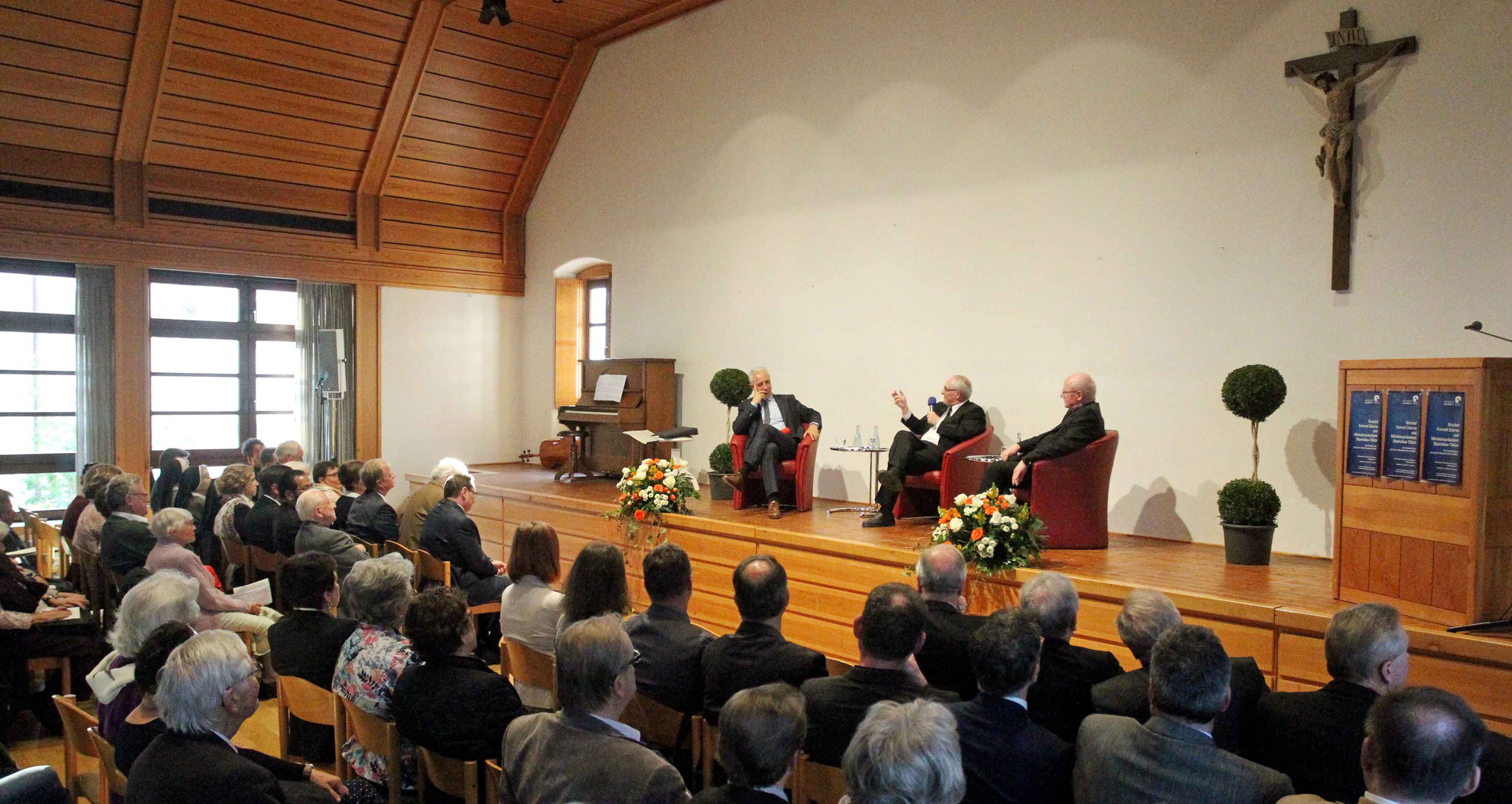 Nördlingen/Augsburg (pba). Bischof Dr. Konrad Zdarsa und Sachsens Ministerpräsident Stanislaw Tillich sind gestern Abend die Gäste bei einer Gesprächsrunde im Pfarrzentrum St. Salvator in Nördlingen gewesen. Das Thema lautete „Kirche im säkularisierten Umfeld“. Eingeladen hatte die Katholische Akademie in Bayern, die anlässlich ihres 60-jährigen Bestehens eine Veranstaltungsreihe durch alle bayerischen Bistümer abhält. Moderator war Msgr. Dr. Florian Schuller, Direktor der Katholischen Akademie in Bayern. Vor rund 200 Gästen sprachen Bischof Zdarsa und Ministerpräsident Tillich über ihre eigene Glaubensbiografie sowie über die Rolle der Kirche in Politik und Gesellschaft.