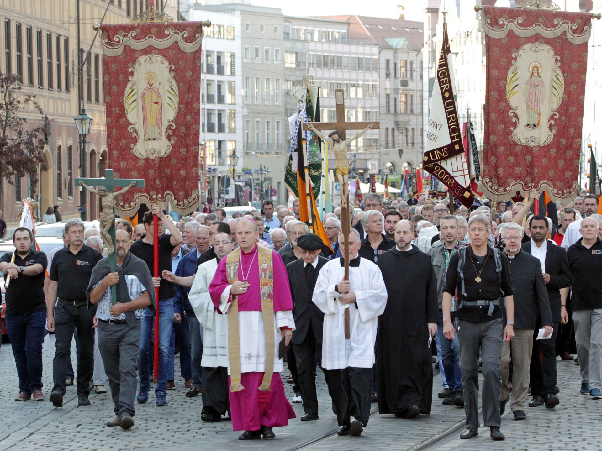 Das brauche unsere Zeit dringender denn je, sagte er in der voll besetzten Basilika St. Ulrich und Afra zu den Teilnehmern der Männerwallfahrt während der Ulrichswoche. Zuvor war er an der Spitze eines langen Prozessionszugs vom Hohen Weg aus mit den Männern zur Ulrichsbasilika gezogen. Wie in jedem Jahr führte die Wallfahrt an Augsburgs Prachtbrunnen am Rathausplatz und auf der Maximilianstraße vorbei. Darauf bezog sich der Weihbischof auch in seiner Predigt, nachdem die Stadt Augsburg erst vor wenigen Tagen mit ihrer Wasserversorgung Weltkulturerbe geworden sei. In Augsburg plätschere und rausche es überall. Und auch der Fisch, mit dem der heilige Ulrich dargestellt werde, könne ein Hinweis auf den Wasserreichtum der Stadt Augsburg und unseres Bistums insgesamt sein, deutete der Weihbischof das Attribut unseres Bistumsheiligen.