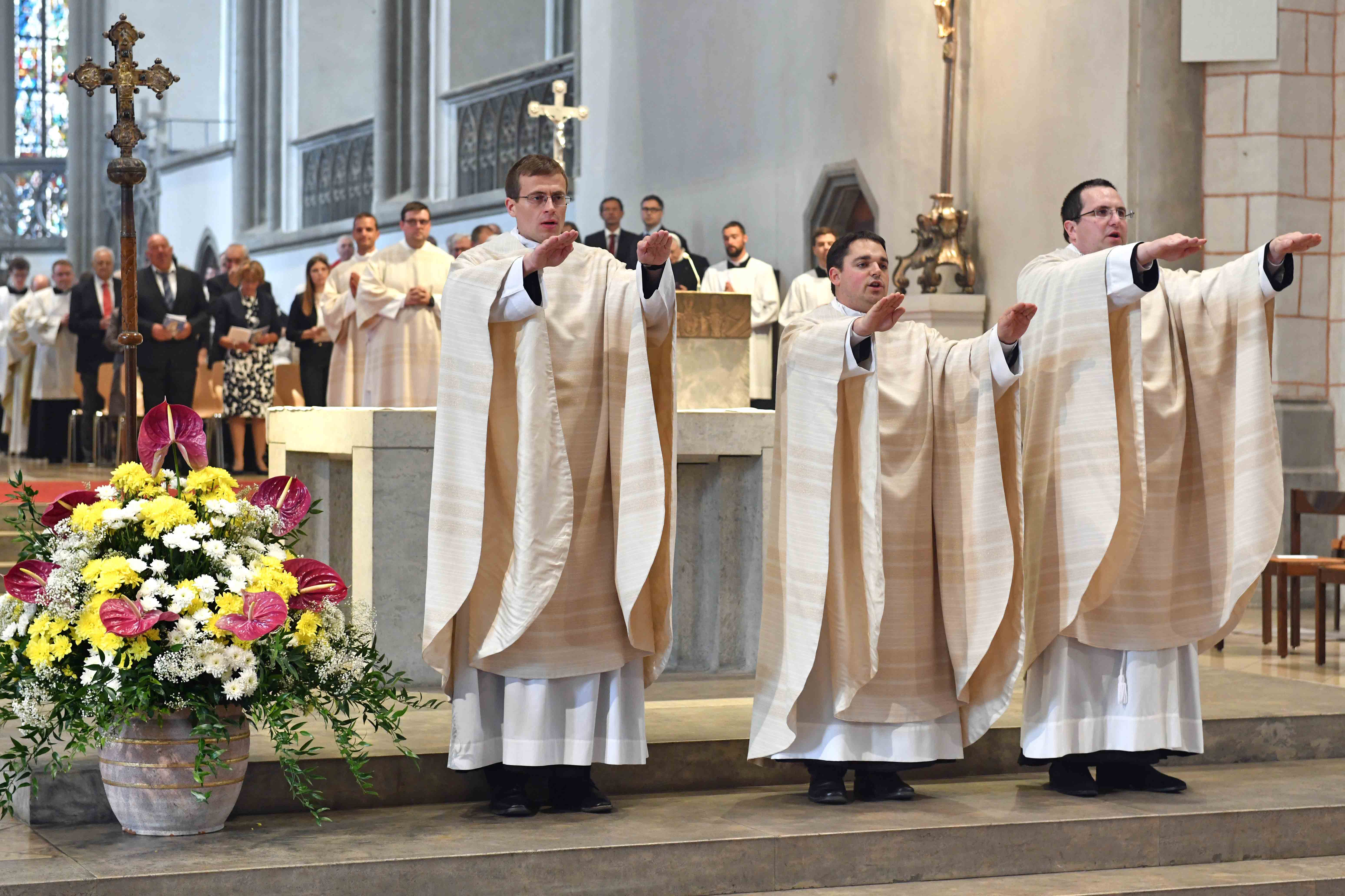 Und der Bischof ging mit Blick auf die Glaubenspraxis gedanklich einen Schritt weiter: „Wenn unsere Kirchen nicht mehr dazu dienen, wenn wir sie dazu nicht mehr oder nur ganz sporadisch aufsuchen, dann sollten wir uns davon trennen und sie irgendeiner Treuhand übergeben.“ Für ihn sei es nämlich nicht zu vertreten, mit großem finanziellem und materiellem Aufwand allein steinerne Gebäude zu erhalten, wenn sie nur noch einer regionalen, kunsthistorischen, rein menschlichen Tradition zur Verfügung stünden. Stattdessen müssten sie auch weiterhin dem andauernden Lobpreis unseres Schöpfers und Erlösers, der Vertiefung und Weitergabe des Glaubens dienen. Vor allem dazu seien die drei neuen Priester von nun an gesandt: „Mit uns Bischöfen sollt ihr nicht nur Verkünder der Frohen Botschaft bis an die Grenzen der Erde sein, sondern auch treue Verwalter der heiligen Mysterien des himmlischen Vaters“, erklärte der Bischof und legte ihnen damit ganz besonders die Sakramente der Taufe, der Eucharistie, der Versöhnung und der Krankensalbung ans Herz.