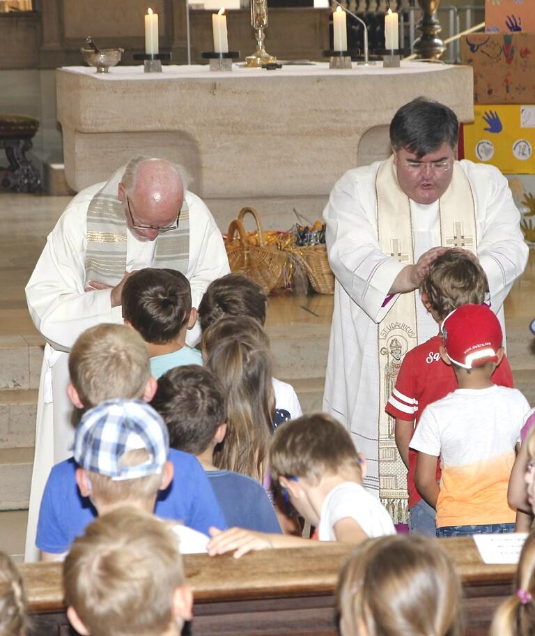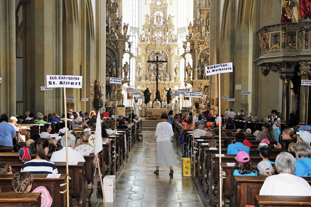 Gemeinsam mit zwölf weiteren Priestern spendete Generalvikar Heinrich jedem Kind und Erwachsenen den Einzelsegen. Danach reihten sich die Kinder in die lange Schlange auf dem Weg hin zum Reliquienschrein des heiligen Ulrich ein. Dort erläuterte ihnen der Neupriester Mathias Breimeier, was es mit dem Schrein auf sich hat, wann der Heilige Ulrich gelebt hat und warum er heute noch verehrt wird. Nach dem Besuch des Ulrichsaltars konnten die Kinder eine Stärkung in besonderer Form in Empfang nehmen. Das Referat Kindergartenpastoral des Bischöflichen Seelsorgeamtes und das Referat Kindertageseinrichtungen des Caritasverbandes für die Diözese Augsburg e. V. hatten nicht nur gemeinsam den Gottesdienst vorbereitet. Sie hatten eigens 500 kleine Brote in der Form eines Fisches backen lassen. Dieses Brot sollte die Kinder an das Kennzeichen des Heiligen Bischofs Ulrich erinnern, der sich immer auch für die Armen eingesetzt hatte.