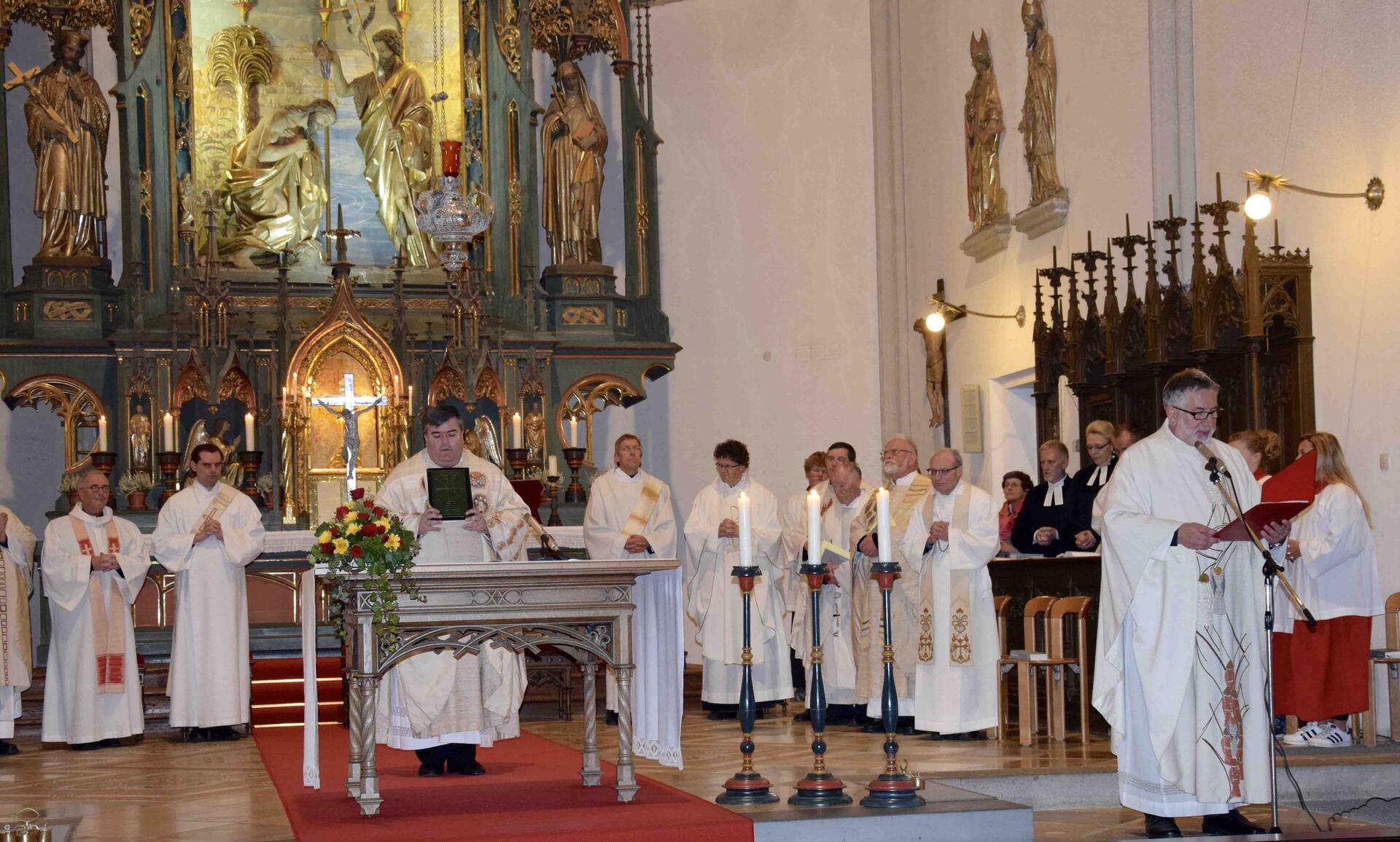 Viele Gläubige sowie Ehrengäste aus Politik und Kirche waren zum Gottesdienst gekommen, der durch den stimmungsvollen Gesang des Chores „Concordia“ gestaltet wurde. Die Ministranten und Amtsbrüder sowie Diakone aus dem Dekanat geleiteten Generalvikar Heinrich und Dekan Matthias in die vollbesetzte Kirche.