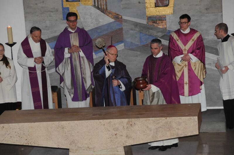 (Vöhringen/Bellenberg) Bischof Dr. Konrad Zdarsa hat gestern Abend in Vöhringen und Bellenberg den Bußritus vollzogen. Diese besondere Form der Liturgie war erforderlich geworden, nachdem vor einigen Wochen die Kirchenräume und Statuen teilweise großflächig beschmiert worden waren. In „Unsere Liebe Frau vom Rosenkranz“ Bellenberg wurde dabei auch der Altarraum nicht verschont und mit satanistischen Parolen geschändet. Das Kirchenrecht sieht für solche Fälle einen Bußritus durch den Diözesanbischof vor.