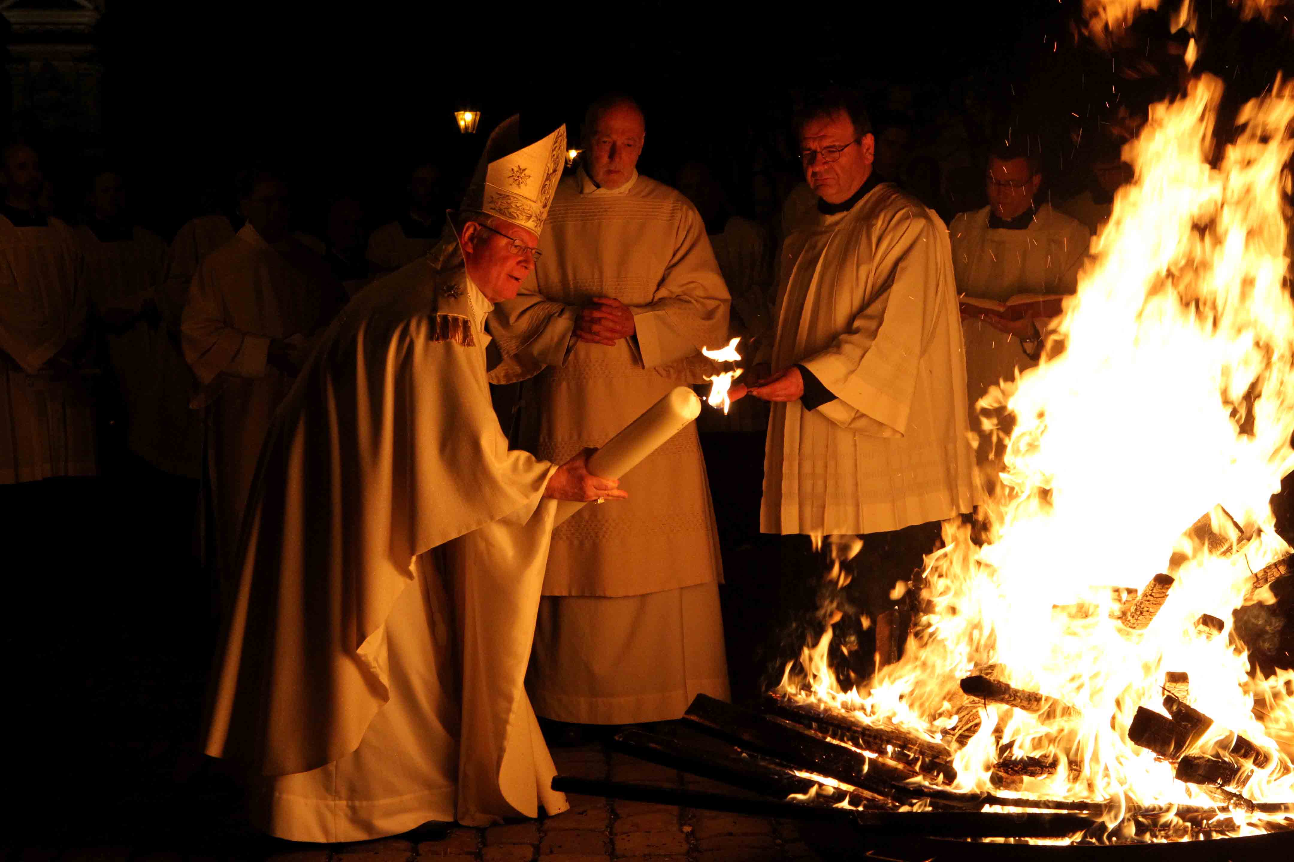 Für eine fromme Einbildung hingegen opfere man nicht sein Leben. „Und die Kette derer, die wegen ihres Festhaltens an dieser Glaubenswahrheit mit dem Leben bezahlten, reißt bis heute nicht ab“, richtete sich Weihbischof Florian an die Gläubigen. Zugleich rief er sie dazu auf, die Botschaft von der Auferstehung müsse auch heute für die Getauften Konsequenzen haben. „Wem bewusst wird und zu Herzen geht, was in der Taufe aus ihm geworden ist, der wird es nicht länger für sich behalten wollen und können“, bekundete Weihbischof Florian. Der Herr sei nicht gestorben und auferstanden, damit wir vorübergehend in österliche Hochstimmung kommen könnten und der graue Alltag im Frühling mit einem frommen Dekor aufpoliert werde. „An uns sollen andere erfahren können, dass garantiert stimmt, was wir heute Nacht verkünden und feiern.“