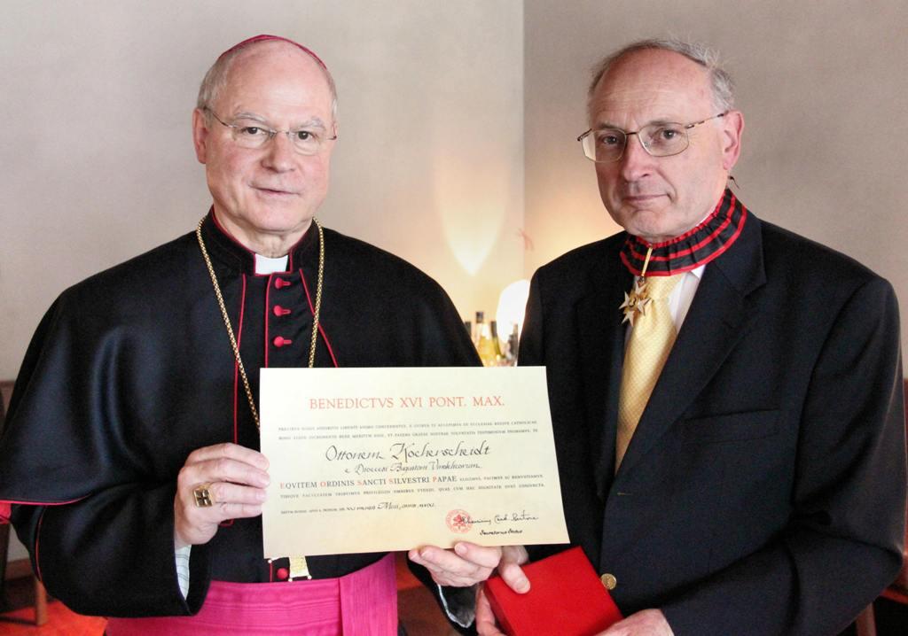 Augsburg (pba). Otto Kocherscheidt, Augsburger Diözesan-Beauftragter für Fälle von sexuellem Missbrauch, ist heute mit dem Päpstlichen Silvesterorden ausgezeichnet worden. Der Bischof von Augsburg, Dr. Konrad Zdarsa, übergab im Rahmen einer Feierstunde im Augsburger Haus St. Ulrich den Orden für Verdienste um die römisch-katholische Kirche an Otto Kocherscheid und hielt die Laudatio auf den Würdenträger. Darin sagte der Bischof: „Herr Kocherscheidt hat sich als Beauftragter und Ansprechpartner mit allergrößter Umsicht und Diskretion der entsprechenden Angelegenheiten angenommen. Diese Aufgabe nahm er völlig unentgeltlich wahr. Seine umfassende juristische Bildung und seine hohe Sensibilität gegenüber den Menschen waren auch bei der Bewältigung durchaus anspruchsvoller und heikler Angelegenheiten eine unverzichtbare Hilfe.“