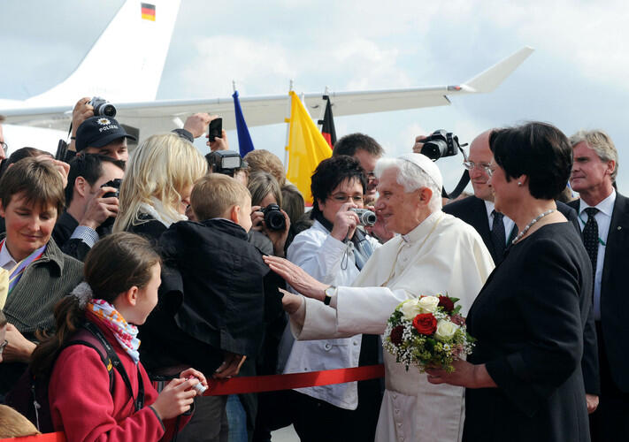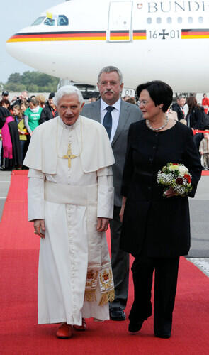 Erfurt (dbk). Papst Benedikt XVI. ist am Donnerstagvormittag zur zweiten Station seines Deutschlandbesuchs eingetroffen. Mit leichter Verspätung brachte ihn ein Airbus der Bundeswehr um 11 Uhr von Berlin nach Erfurt. Auf dem Flughafen empfingen ihn die Ministerpräsidenten von Thüringen, Sachsen und Sachsen-Anhalt und mehrere ostdeutsche Bischöfe, angeführt vom Erfurter Bischof Dr. Joachim Wanke. Dabei nahm sich der Papst erstmals während seines Besuches Zeit, einigen Bürgern am Rande des Rollfelds die Hände zu schütteln. Thüringens Ministerpräsidentin Christine Lieberknecht überreichte Benedikt XVI. ihre Doktorarbeit als Geschenk, die sie 1982 als evangelische Theologin über die Confessio Augustana von 1530 geschrieben hatte. Die Confessio Augustana ist eine zentrale Bekenntnisschrift der deutschen Lutheraner.