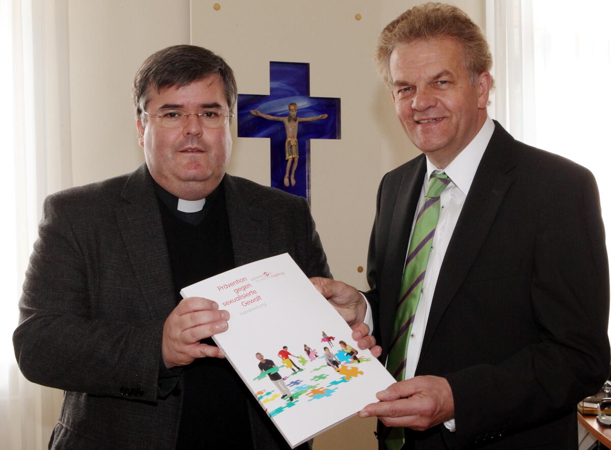 Soeben hat Generalvikar Harald Heinrich das erste Exemplar dieser Handreichung an Pastoralreferent Bernhard Scholz überreicht, der die diözesane Koordinationsstelle zur Prävention gegen sexualisierte Gewalt leitet und maßgeblich an der Vorbereitung der Handreichung beteiligt war. „Prävention gegenüber jeder Form von Gewalt, insbesondere sexualisierter Gewalt, ist eine zentrale Verpflichtung aller in unserer Kirche, ob beruflich oder ehrenamtlich tätig“, betont Generalvikar Heinrich in der Handreichung. Es liege ihm sehr am Herzen, dass jede und jeder im Bistum den eigenen Beitrag leiste, damit unter uns eine „Kultur der Achtsamkeit“ wachse. „Denn insbesondere Schutzbefohlene, ob Kinder, Jugendliche oder Erwachsene, sollen sich in den verschiedenen Lebens- und Arbeitsbereichen der Kirche von Augsburg sicher fühlen und entfalten können“, so der Generalvikar weiter. Sein besonderer Dank gilt dem diözesanen Team, das die Handreichung erstellt hat. „In gleicher Weise gilt dies schon jetzt all jenen, die in den Pfarrgemeinden die Verantwortung für die Umsetzung übernehmen werden.“ Die Präventionsordnung sieht vor, dass in jeder Pfarrei beziehungsweise Pfarreiengemeinschaft hierfür eine verantwortliche Person benannt wird.