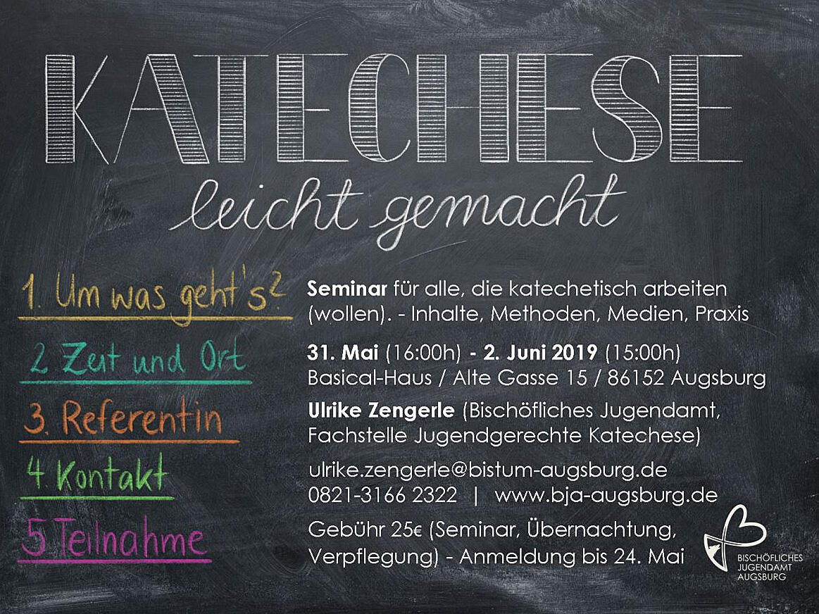 Das Seminar findet im Basical-Haus, Alte Gasse 15, in Augsburg statt. Es richtet sich an alle, die katechetisch arbeiten (wollen) und dient darüber hinaus als Fortbildung für haupt- und ehrenamtliche Mitarbeiter/-innen in Pfarreien oder Gemeinschaften vor Ort. Eine Übernachtung im Basical-Haus ist möglich. Anmeldeschluss ist der 24. Mai. Weitere Informationen gibt es beim Bischöflichen Jugendamt.