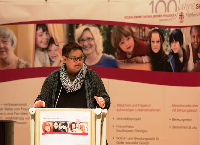 In ihrer einführenden Rede beschrieb Doris Hallermayer, die Vorsitzende des SkF Augsburg die ständig steigenden Herausforderungen an die soziale Arbeit. Oft brächten die Klientinnen ein ganzes Bündel an Problemlagen mit, die gemeinsam mit den Betroffenen bearbeitet werden müssen um zu einer langfristigen Lösung zu kommen. Der SkF als Träger der sozialen Arbeit ist aber darauf angewiesen, die eigene Arbeit ständig weiterzuentwickeln und Visionen zu entwickeln um auf neue Notlagen reagieren zu können. Dies ist nur möglich durch eine starke Unterstützung des Bistums, der Politik und durch Privatpersonen.
