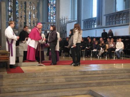 Augsburg (pba). Bischof Dr. Konrad Zdarsa hat am 1. Fastensonntag im Rahmen eines Wortgottesdienstes im Augsburger Mariendom Katechumenen aus verschiedenen Pfarreien der Diözese Augsburg zu den Sakramenten Taufe, Firmung und Eucharistie zugelassen.