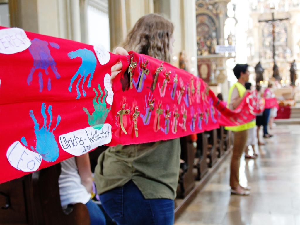 Das Band mit Gott hätten die Kinder schon geschlossen. Seit ihrer Taufe seien sie Freunde und Jünger Gottes. Daran erinnerte auch ein über 100 Meter langes rotes Band, das die Kinder mit in die Kirche getragen hatten und vom Taufwasserbecken bis zum Altar auf den Boden gelegt worden. Am Ende des Gottesdienstes spendete Bischof Dr. Zdarsa gemeinsam mit zehn Priestern und Diakonen den Kindern und den begleitenden Erwachsenen den Einzelsegen. Mechtild Teuber, Leiterin des Referates Kindertageseinrichtungen des Caritasverbandes für die Diözese Augsburg e. V., und Margret Färber, Leiterin der Kindergartenpastoral im Seelsorgeamt der Diözese Augsburg, hatten den Gottesdienst gemeinsam vorbereitet. So, wie die Kinder aufpassten, können sie dankbar auf den Wallfahrtsgottesdienst zurückblicken. Ihr gewähltes Motto „Der Heilige Ulrich knüpft ein Band zwischen uns und Gott“ hat sich wohl in der Aufmerksamkeit der Kinder widergespiegelt.