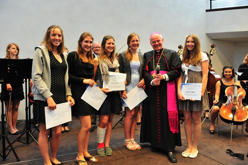 Augsburg (pba). Im Rahmen des Schulwerkstages in der Ulrichswoche hat Weihbischof Dr. Dr. Losinger heute erstmals den Canisius-Preis, einen Sozialpreis des Schulwerkes der Diözese Augsburg, verliehen. Der Canisius-Preis des Schulwerks geht in diesem Jahr an fünf Schülerinnen aus Mindelheim und Günzburg. Johanna Irsigler ist Gymnasiastin am Maristenkolleg Mindelheim (12. Jahrgangsstufe). Sie unterstützt und begleitet seit mehreren Jahren einen schwerbehinderten Mitschüler im Schulalltag und das auch in der Oberstufe, obwohl sie keinen gemeinsamen Unterricht mit ihm mehr hat. Der Mitschüler sitzt im Rollstuhl, kann Arme und Hände nur minimal bewegen und schreibt daher mit dem Mund.