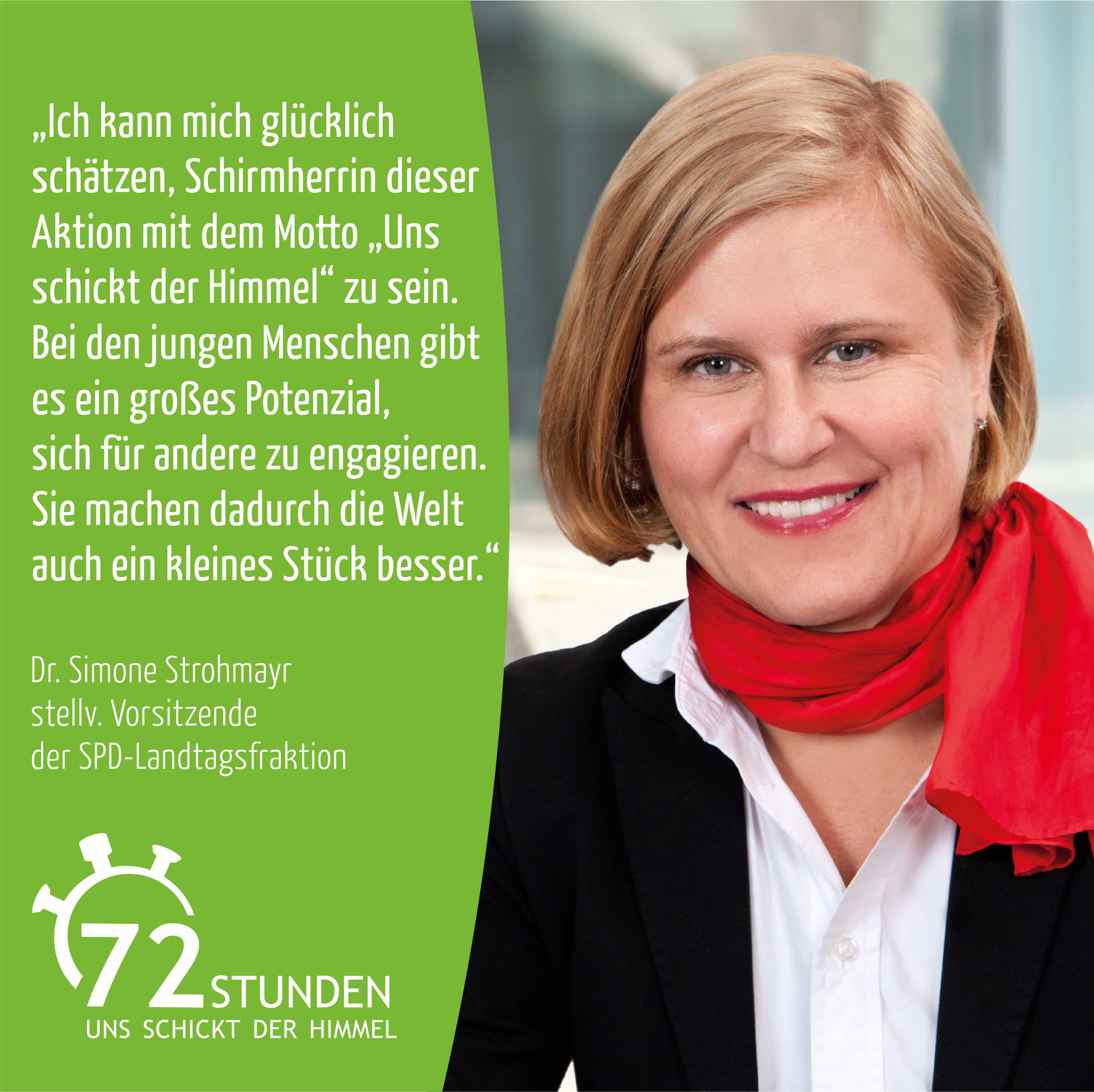 Auch Schirmherrin Dr. Simone Strohmayr, stellvertretende Fraktionsvorsitzende der SPD-Landtagsfraktion, freut sich schon auf die anstehende 72-Stunden-Aktion: „Ob in der Flüchtlingshilfe, im Seniorenzentrum oder im Kindergarten, ich freue mich schon darauf, wenn die Teilnehmer innerhalb dieser drei Tage ein soziales, ökologisches oder kulturelles Projekt umsetzen werden. Dem BDKJ wünsche ich viel Spaß und Erfolg bei der Umsetzung der Sozialaktion. Bei den jungen Menschen gibt es ein großes Potenzial, sich für andere zu engagieren. Sie machen dadurch die Welt ein kleines Stück besser. Ich kann mich glücklich schätzen, Schirmherrin dieser Aktion mit dem Motto „Uns schickt der Himmel“ zu sein.“