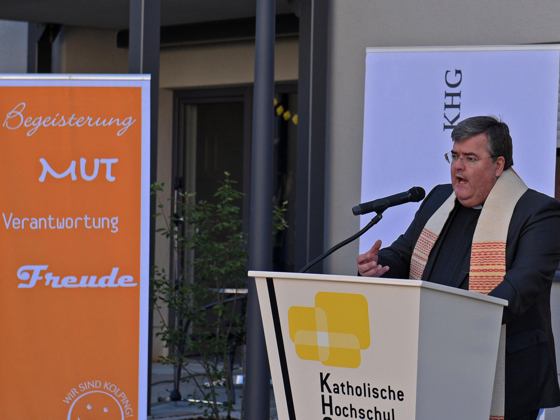 „Wo sonst kann man schon mit Hausschuhen direkt aus den Zimmern in die Kapelle gehen?“ unterstrich Domkapitular und Hochschulpfarrer Dr. Thomas Groll diesen Gedanken in seiner Ansprache und betonte gleichzeitig die Bedeutung der KHG für die Bewohner des Studentenwohnheims. „Hier können wir wirklich Kirche vor Ort sein und die jungen Studierenden seelsorglich und auch praktisch begleiten“, so Domkapitular Groll.